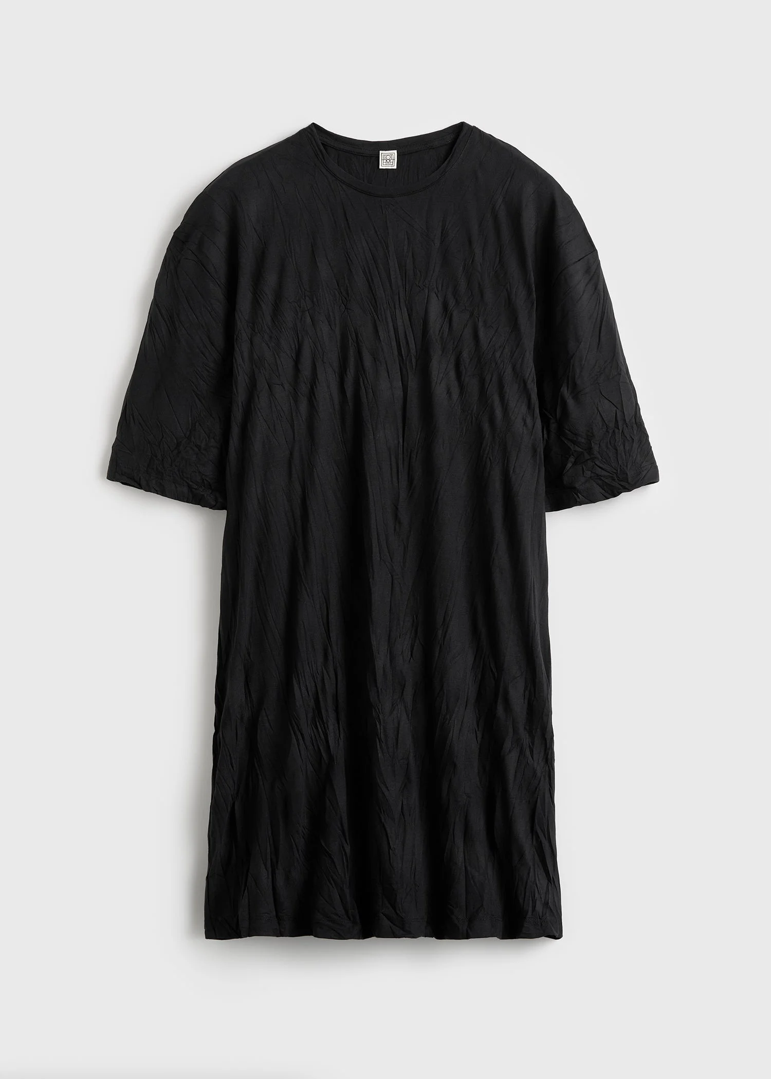 Loose dress inspired by an oversized tee, with dropped shoulders and elbow-grazing sleeves. This season the silhouette is realized in a crinkled jersey that has permanent sculptural creases to evoke a lived-in softness. Details - Black - 50% cotton, 50% polyester - Dry clean - Style number 262-WRT0594-FB0642 Fit information - The model is 180cm/5'11” tall and wears a size S - Relaxed fit, boxy sleeves Origin & Certificates - Product contains at least 50% recycled content - Made in Portugal - Manufacturer: Texmade-Texteis, Lda - Material knit in Portugal; dyed in Portugal