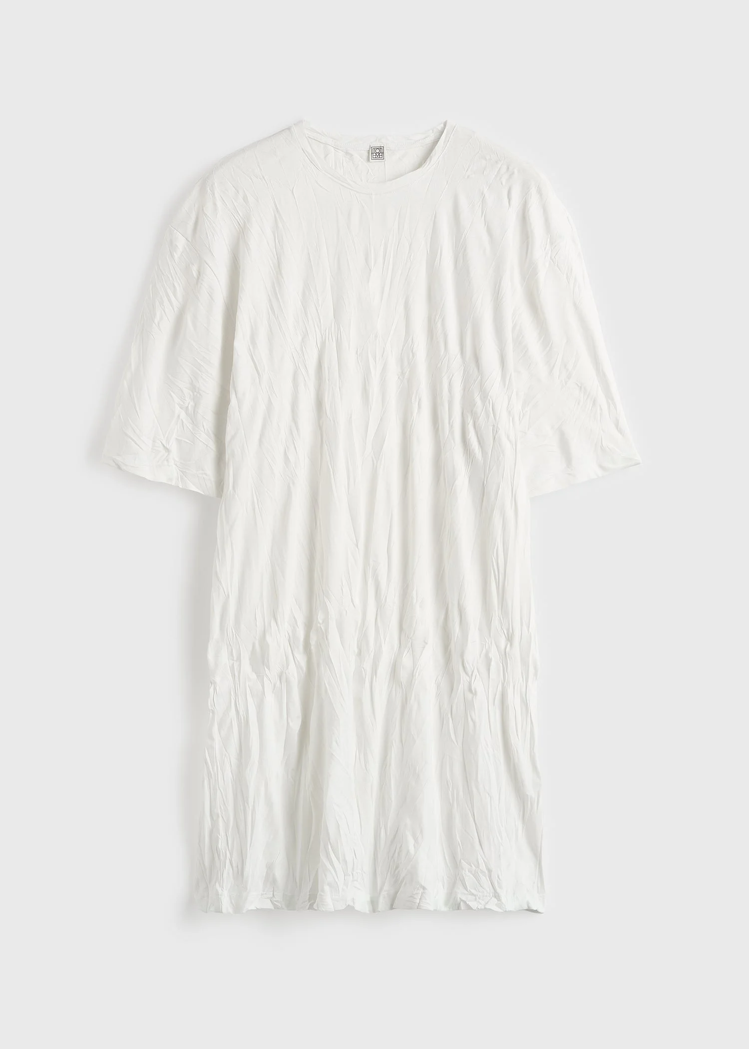 Loose dress inspired by an oversized tee, with dropped shoulders and elbow-grazing sleeves. This season the silhouette is realized in a crinkled jersey that has permanent sculptural creases to evoke a lived-in softness. Details - Off-white - 50% cotton, 50% polyester - Dry clean - Style number 262-WRT0594-FB0642 Fit information - The model is 180cm/5'11” tall and wears a size S - Relaxed fit, boxy sleeves Origin & Certificates - Product contains at least 50% recycled content - Made in Portugal - Manufacturer: Texmade-Texteis, Lda - Material knit in Portugal; dyed in Portugal