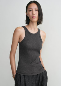 Signature TOTEME tank top made from ribbed organic-cotton jersey blended with a hint of elastane for a comfortable, body-hugging fit. It has a high round neck and curved armholes that accentuate the shoulders, then is finished with a straight hem. Wear it tucked into high-waist trousers. Details & Fit - Charcoal - 93% cotton organic, 7% elastane - 30°C machine wash - Style number 243-WRT1129-FB0246 - True to size, slim fit - The model is 180cm/5'11 tall and wears a size S