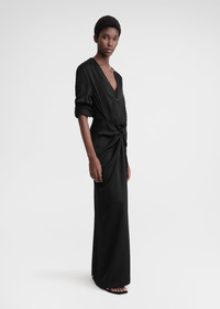 Perfect for a summer evening look, TOTEME's dress is designed to be knotted at the front like a sarong. It's crafted from softly slubbed viscose satin with an effortless drape and fastens with buttons along the front placket. Complement the plunging neckline with a considered jewelry piece. Details & Fit - Black - Buttoned placket and cuffs - Attached waist ties - 100% viscose - Dry clean - Style number 242-WRD1730-FB0160 - The model is 178cm/510 tall and wears a size 36 - Regular fit, true to size