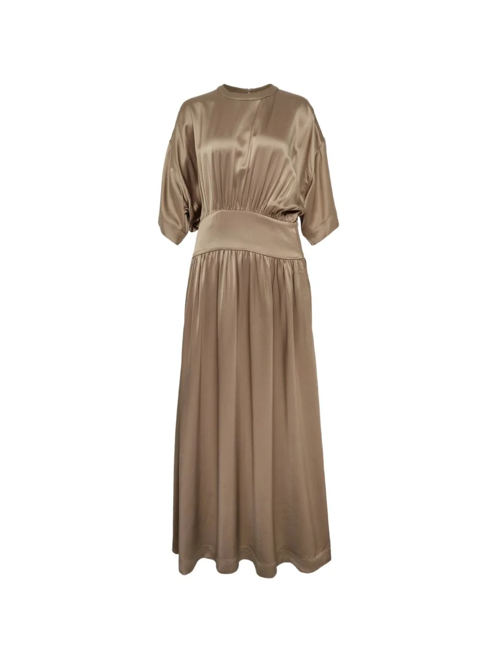 gathered detail dress Highlights - Brown - Gathered detail - Crew neck - Midi length - Fluid silhouette Imported Composition Satin 100% Washing instructions Read Manufacturer Guidelines