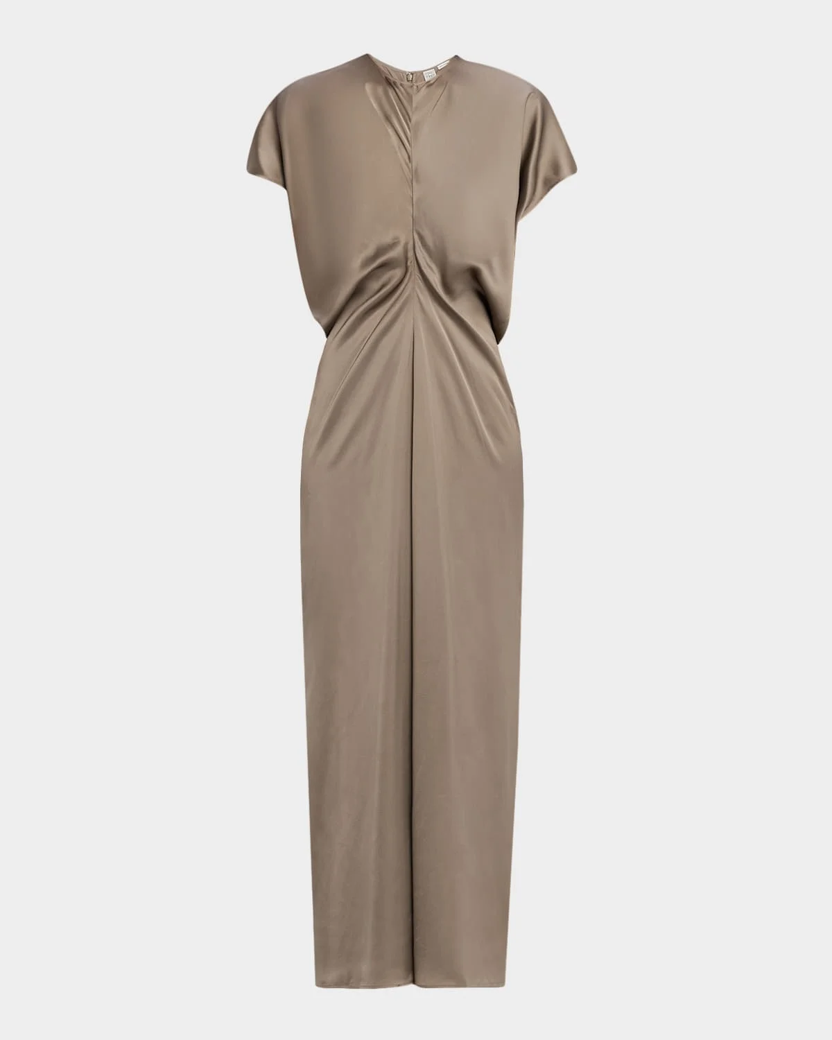 Toteme fluid satin dress constructed from curved panels that create a slouching effect at the waist when sewn together Round neckline Short sleeves Full length Aline silhouette Back zipper Viscose Hand wash Imported