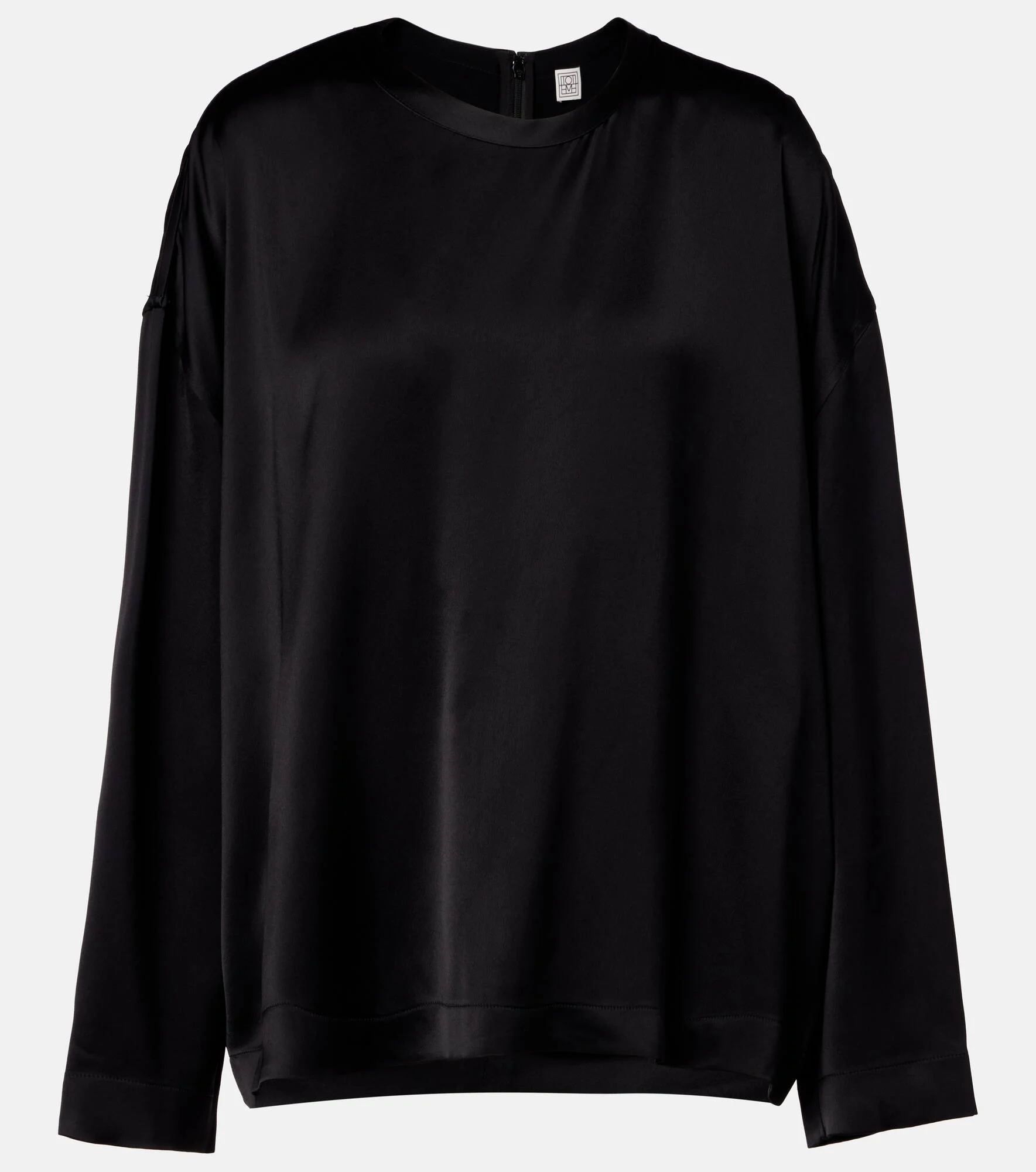 Define your dress code with styles from Toteme, a Stockholm-based brand dedicated to creating a modern uniform. This top is made from satin to a boxy long-sleeved silhouette. Product Details - Material: 100% viscose - Care instructions: dry clean - Made in China - Color: black - Designer color name: Black - Item color: black - Closure: concealed zipped back - Item number: P01136629 Size & Fit - Fits large to size - we recommend trying one size smaller - Dropped shoulders - Designed for a loose fit - Non-stretchy fabric - Falls below the hip - The model seen in the picture is 178cm-5'10" and wearing a size DE 32