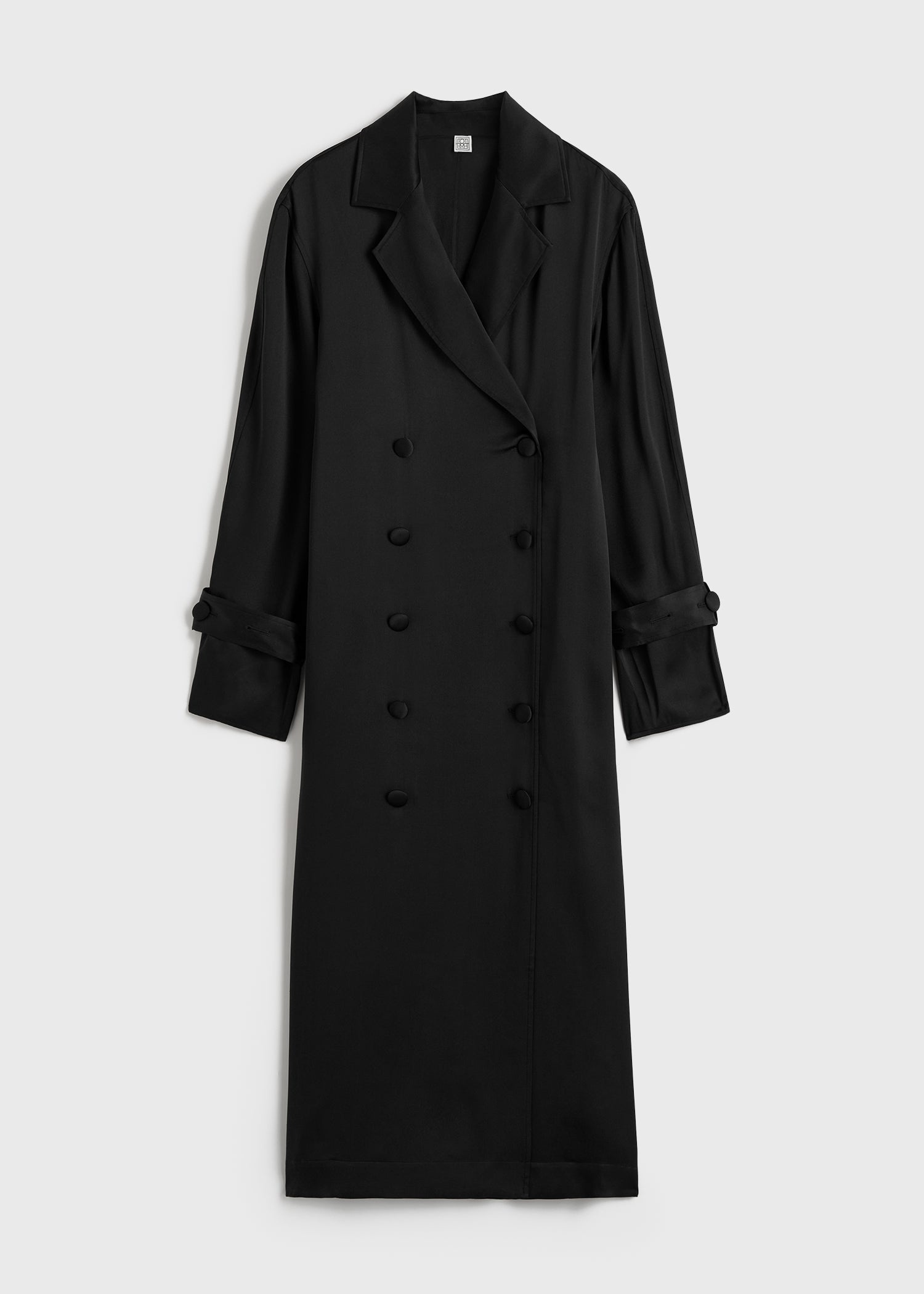 Our signature TOTEME trench coat is reimagined as a long satin dress for special occasions. It has a straight, double-breasted silhouette set with buttons, slip pockets and detachable belts dangling gracefully from the cuffs. Style it with mules as part of an elegant evening look. Details & Fit - Black - Double-breasted button front - Slip pockets - Detachable cuff belts - 100% viscose - Cool hand wash - Style number 251-WRD0162-FB0020 - The model is 176cm/59 tall and wears a size 36 - True to size, relaxed fit