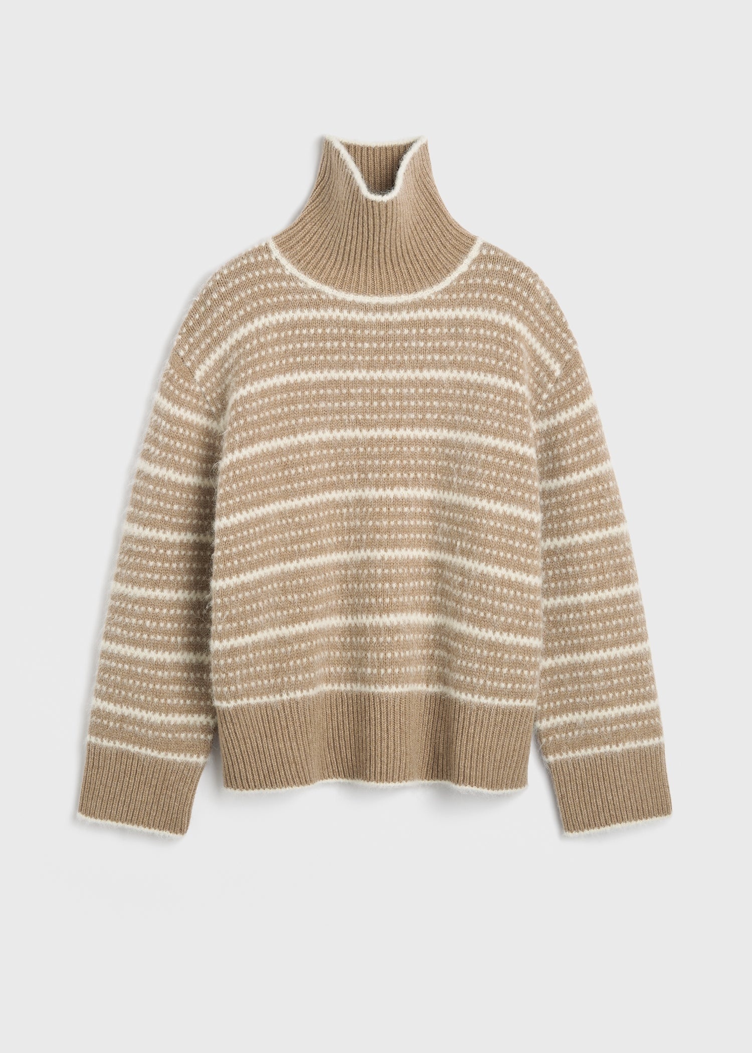 TOTEME sweater inspired by traditional Scandinavian knitwear and accented with an eye-catching pattern of dotted lines. It is knitted with warm wool fibers to a wide, oversized silhouette with a turtleneck and extra-long sleeves. Wear it with the matching beanie and gloves during a winter getaway. Details & Fit - Soft camel - Camel and white pattern - Ribbed edges - 78% wool RWS, 17% alpaca, 5% recyled polyamide - Cool hand wash - Style number 251-WRT4811-YA0110 - Oversized fit - The model is 178cm/510 tall and wears a size S