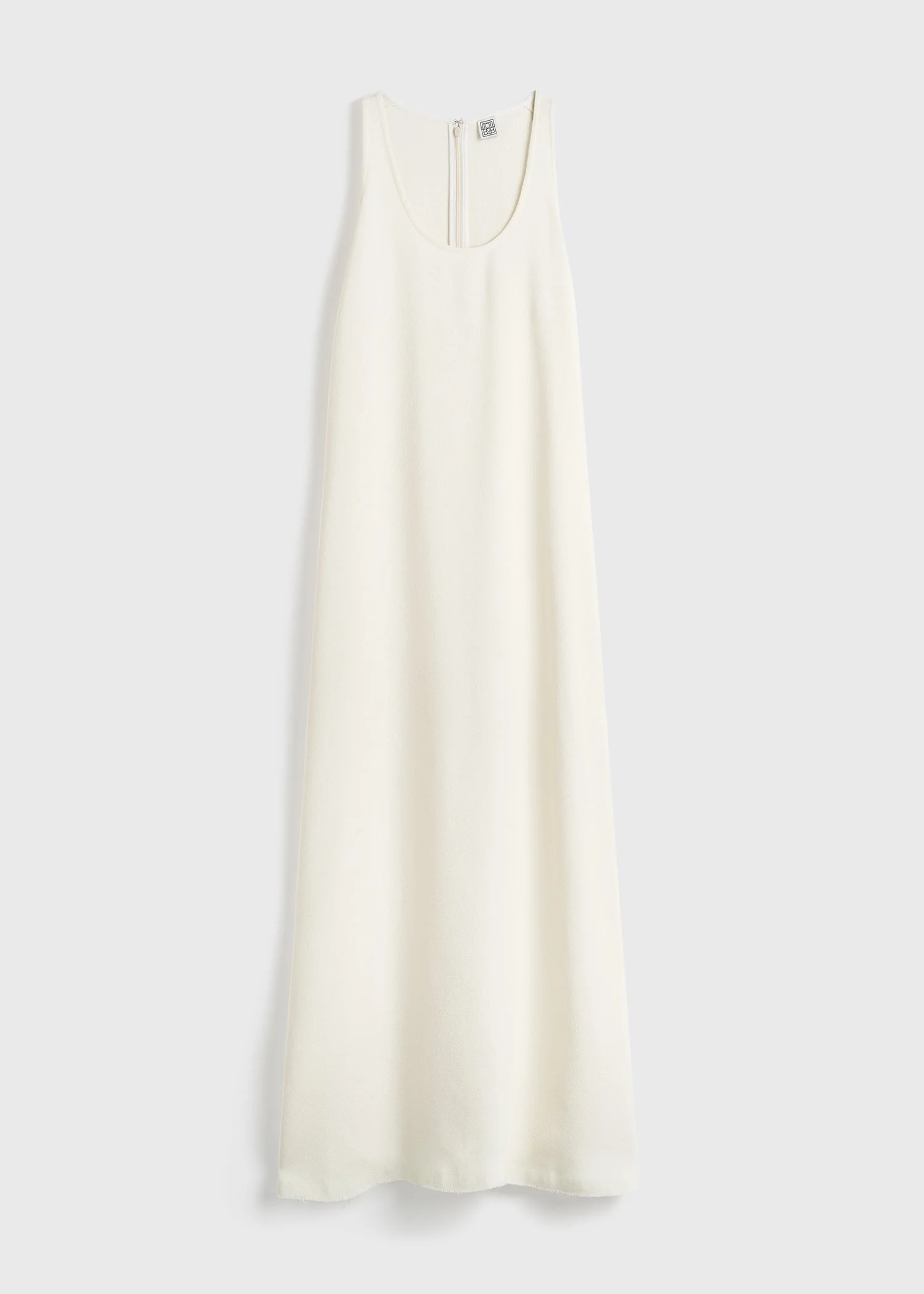 Designer’s note: “What sets this TOTEME Garderob tank dress apart is its understated scoop neckline and elongated silhouette, elevated by the rich texture of the sable fabric and the raw, frayed hem. Wear it during the day with sandals to channel a bohemian summer mood, then add a clutch to transition seamlessly to dinner.” Details & Fit - Macadamia - Raw hem - Concealed back zipper - Mid-weight sable with a soft texture and fluid drape - 100% viscose - Dry clean - Style number 243-WRD4142-FB0240 - The model is 181cm/511 tall and wears a size 36 - Relaxed fit, low armholes and long silhouette