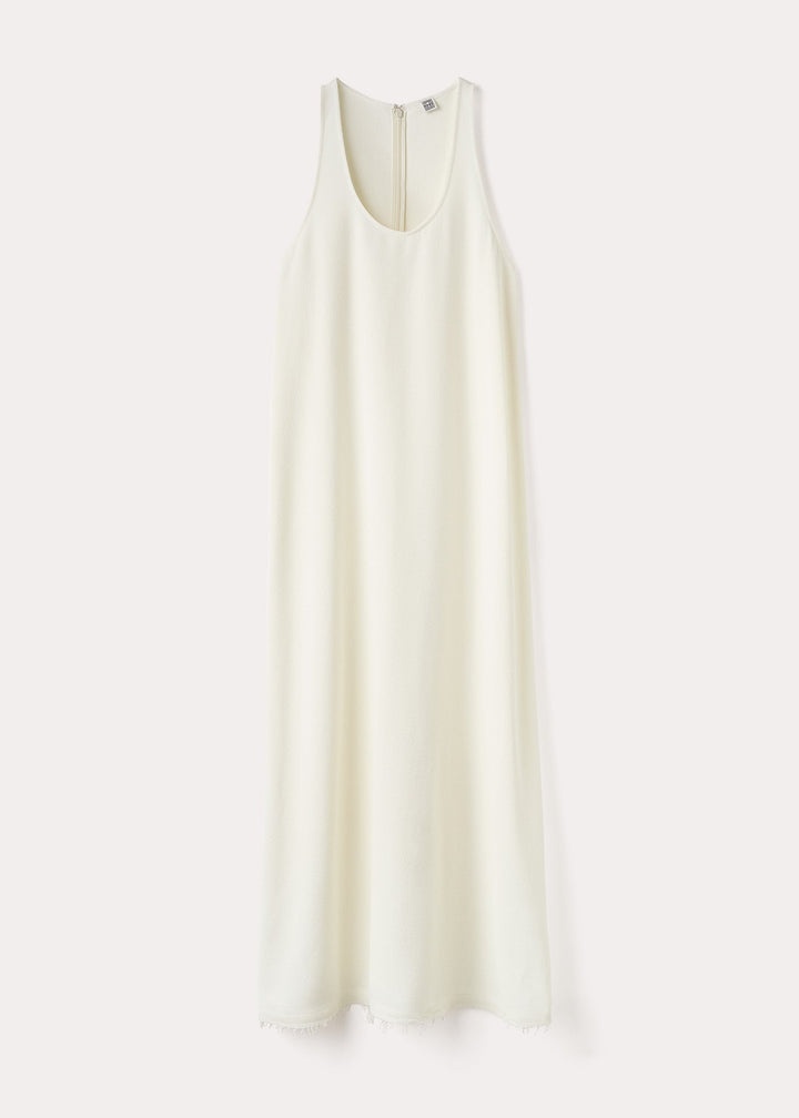 TOTEME dress defined with an ample scoop neck and an A-line silhouette with a raw hem. It's made from heavyweight viscose sablé and can be worn on its own or layered over a fine top or sweater. Let it drape freely or cinch it at the waist with a belt. Details and fit - Macadamia - Low armholes - Raw hem - Concealed back zipper - 100% Viscose - 30°C Machine wash - Style number 233-6033-280 - The model is 176cm/5'9'' tall and wears a size 34 - True to size, A-line silhouette