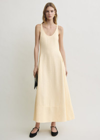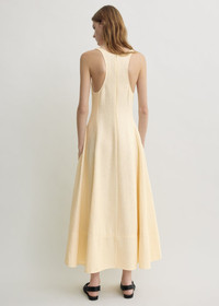 Long sleeveless dress cut from fine cotton tweed with a sculptural silhouette. Fitted through the bodice and waist, it flows into a full A-line skirt with a wide hem and clean lines. Details - Ecru - Concealed back zipper - Side-seam pockets - 51% recycled GRS cotton, 49% cotton - Dry clean - Style number 262-WRT0739-FB0614 Fit information - The model is 180cm/5’11” tall and wears a size 36 - Slim fit, full skirt Origin & Certificates - This product contains 51% Global Recycled Standard (GRS) certified recycled cotton, certified by Control Union, license number 1154443 - Product contains at least 51% recycled content - Made in Portugal - Manufacturer: Priority Season - Material woven in Italy; dyed in Italy