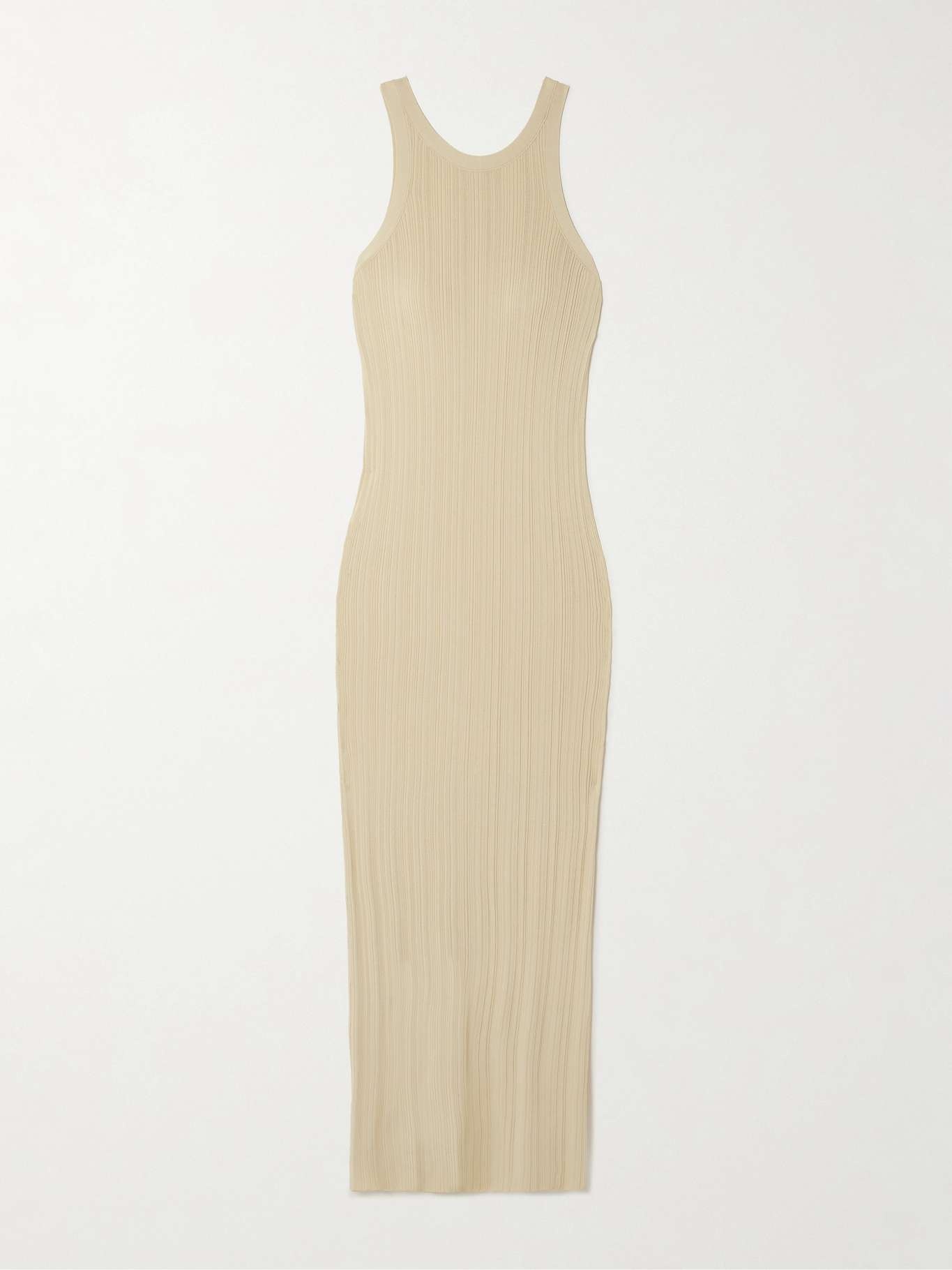 EDITORS'NOTES TOTEME's co-founder Elin Kling is "strategic" about her designs to ensure they're as functional as they are chic. This knitted dress has a sporty racerback and graduated ribbing through the fitted silhouette to contour your curves. The versatile cream shade will go with nearly any accessory. SIZE & FIT Model measurements: - Fits true to size, however those who are between sizes should take the smaller size - Designed for a close fit - Mid-weight knit - Model is 180cm/ 5'11" and is wearing a size Small - Bust: 80cm/ 31.5" - Waist: 65cm/ 25.5" - Hip: 89cm/ 35" DETAILS & CARE - Cream viscose and recycled polyamide-blend - Slips on - 63% viscose, 37% recycled polyamide - Designer color: Oyster