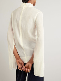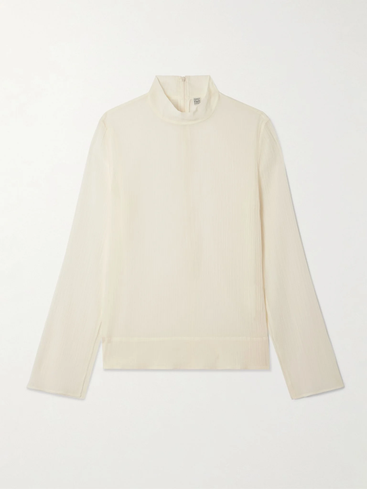 Simplicity is at the core of TOTEME's refined collections. Made from semi-sheer cotton and silk-blend crepon, this blouse has a chic turtleneck and generous splits along the sleeves, showing off a stack of bracelets or your favorite watch. Size & Fit TOTEME follows its own size guide, please refer to below: - DK 32 = UK 4/ US 0/ IT 36 - DK 34 = UK 6/ US 2/ IT 38 - DK 36 = UK 8/ US 4/ IT 40 - DK 38 = UK 10/ US 6/ IT 42 - DK 40 = UK 12/ US 8/ IT 44 - DK 42 = UK 14/ US 10/ IT 46 - Fits true to size, take your normal size - Cut for a slightly loose fit - Lightweight, non-stretchy fabric - Model is 180cm/ 5'11" and is wearing a DK 36 Model measurements: - Bust: 80cm/ 31.5" - Waist: 65cm/ 25.5" - Hip: 89cm/ 35" Details & Care - Ecru cotton and silk-blend crepon - Concealed zip fastening along back - 79% cotton, 21% silk