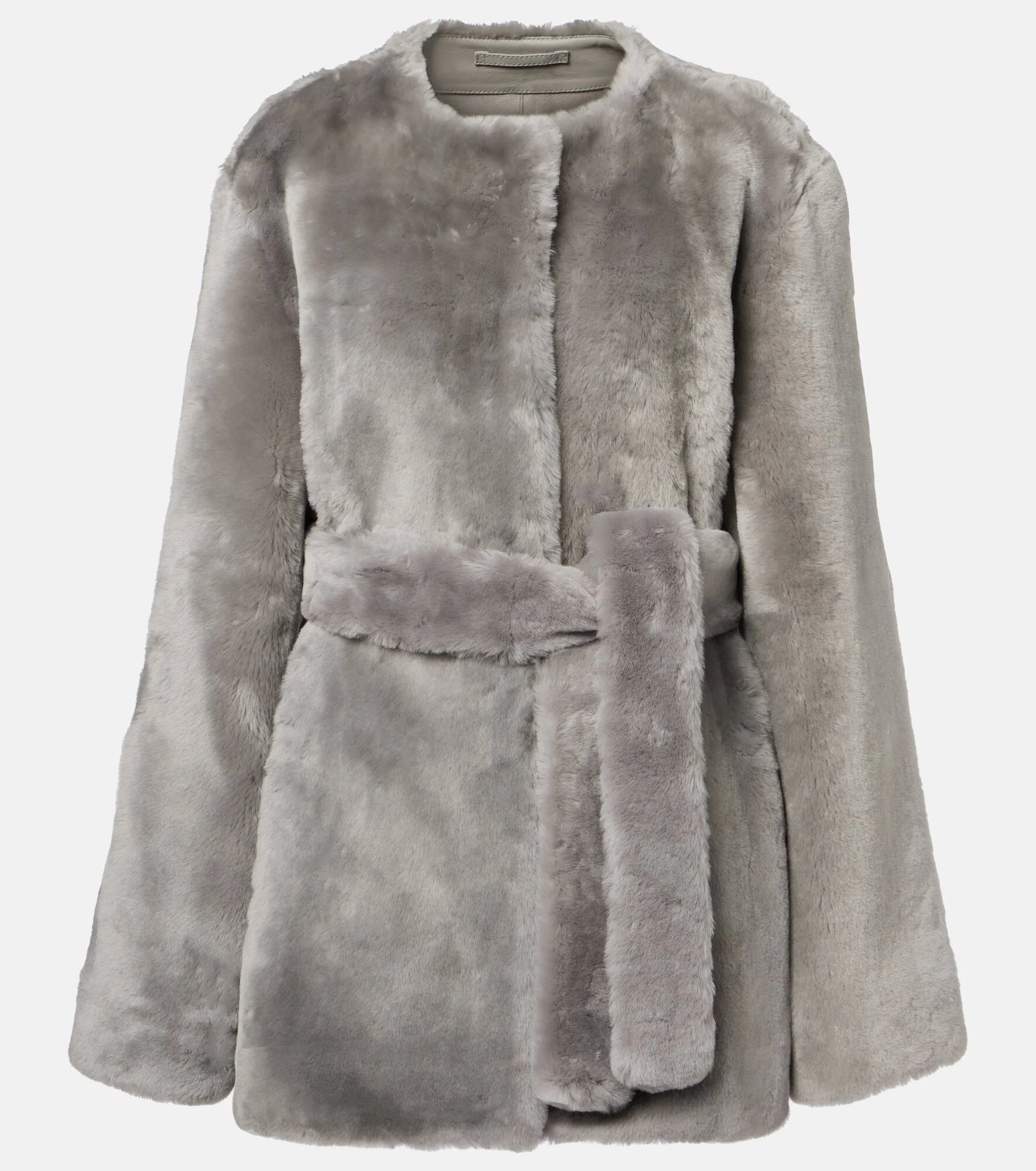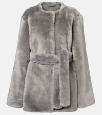 Define your dress code with styles from Toteme, a Stockholm-based brand dedicated to creating a modern uniform. Made with shearling, this jacket has a hook-fastening front, side slit pockets, and a detachable belt. Product Details - Material: 100% shearling - Care instructions: specialist clean - Made in Turkey - Designer color name: Grey - Item color: gray - Lining: 100% lamb leather - Closure: hook-fastening front - Pockets: side slit pockets - Detachable belt - Item number: P01102034 Size & Fit - True to size - Loose fit, comes with belt - Non-stretchy fabric - Falls below the hip - The model seen in the picture is 178cm-5'10" and wearing a size DE 34