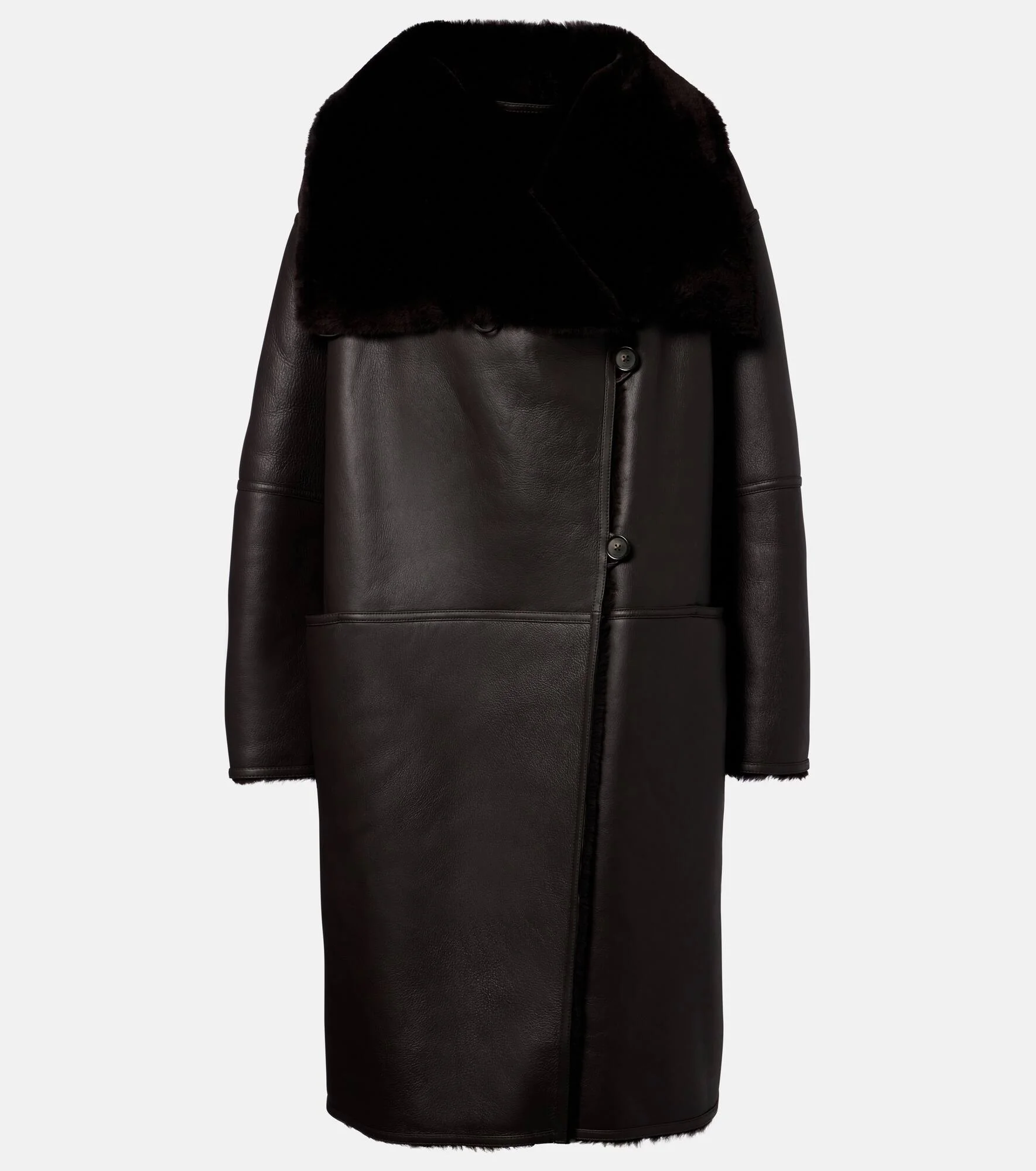 Define your dress code with styles from Toteme, a Stockholm-based brand dedicated to creating a modern uniform. Made from dark brown leather with tonal shearling lining, this coat is a single-breasted piece with concealed button fastenings and an oversized silhouette. Product Details - Material: 100% lamb leather - Care instructions: specialist clean - Made in Turkey - Designer color name: Dark Brown - Item color: brown - Lining: 100% shearling - Closure: buttoned front - Pockets: side slit pockets - Item number: P01136682 Size & Fit - True to size - For a closer fit, we recommend taking one size down - Dropped shoulders - Oversized - Non-stretchy fabric - Falls below the hip - The model seen in the picture is 178cm-5'10" and wearing a size DE 32