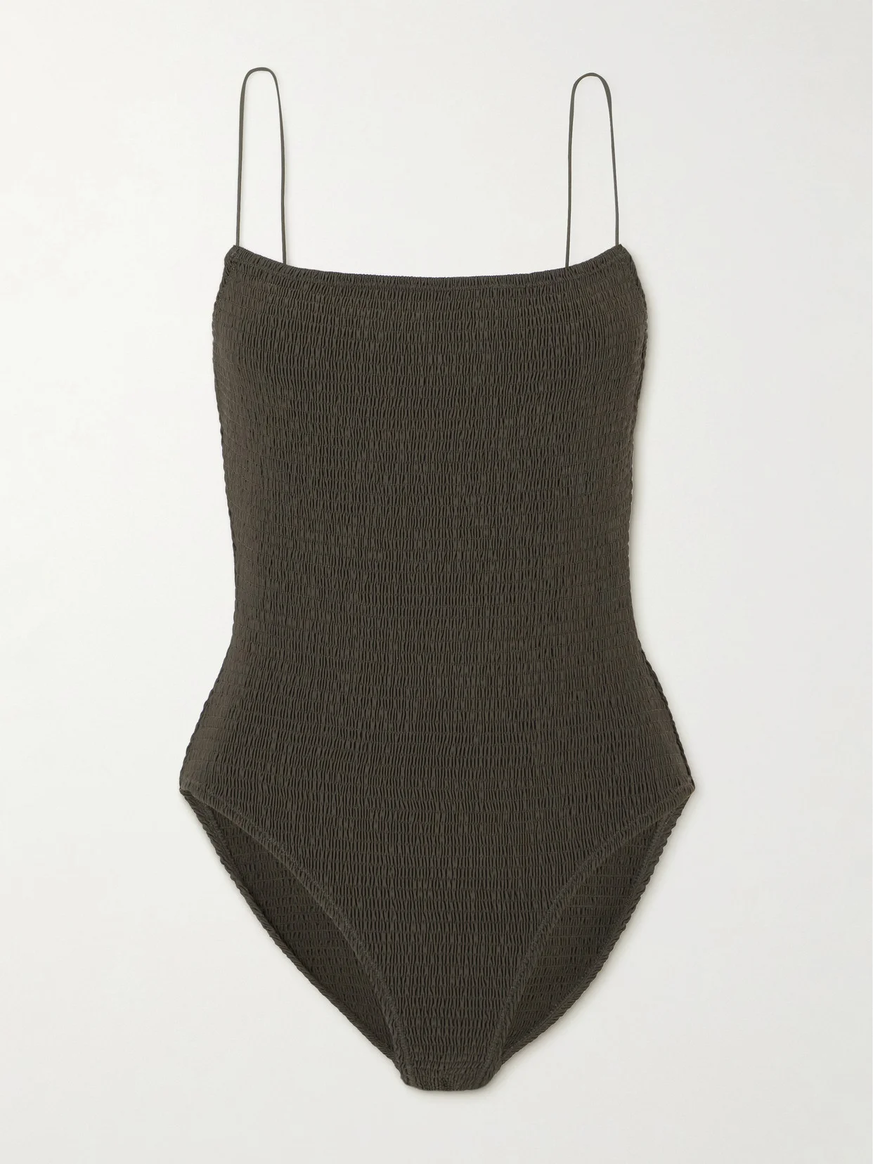 TOTEME's swimsuit is made from shirred stretch fabric that beautifully molds to your figure, offering a close yet flexible fit. It has pin-thin straps and a simple design that suits any destination, from your backyard to tropical locales.