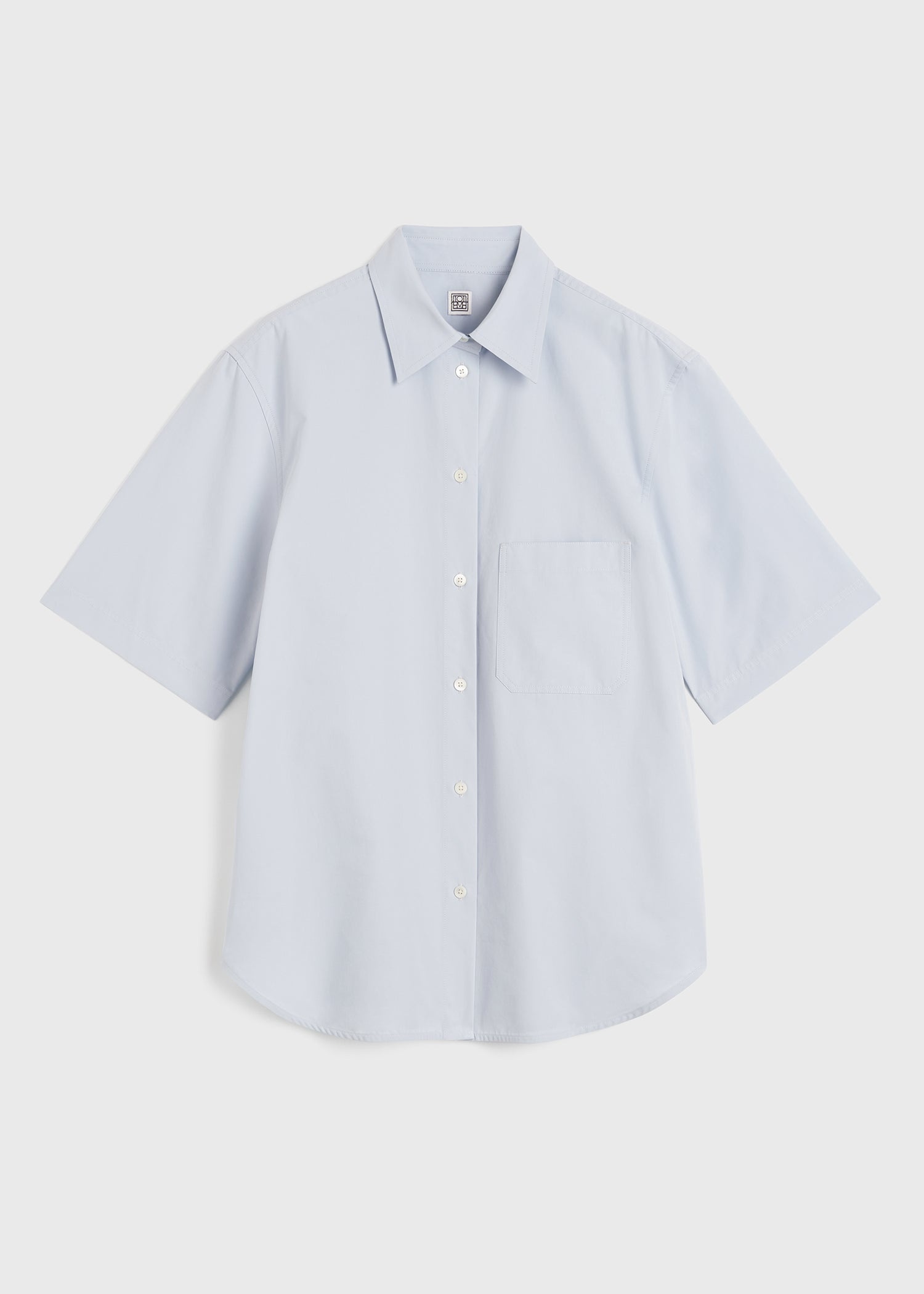 TOTEME shirt constructed to a modern straight silhouette framed with elbow-length short sleeves. It's made from light organic-cotton poplin that's washed for a peachy effect and set with a single patch pocket at the chest. Leave it untucked over wide trousers. Details & Fit - Ice - Patch pocket - Button front - Back yoke, box pleat - 100% cotton organic - 40°C Machine wash - Style number 242-WRT1438-FB0119 - The model is 178cm/510 tall and wears a size 36 - Relaxed fit, boxy silhouette