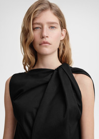 TOTEME top twisted at the shoulder to create a sculptural drape over the arm. It's made from structured cotton blended with linen and has a slanted hemline that mirrors the direction of the drape. Complete an occasion look with coordinating trousers. Details & Fit - Black - Slip-on - Twisting on one shoulder - 83% cotton organic, 17% linen - 30°C Machine wash - Style number 242-WRT1468-FB0105 - The model is 179cm/5'10" tall and wears a size 36 - Regular fit; boxy at the top, fitted on the hips