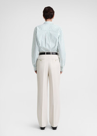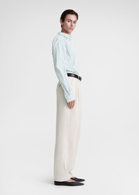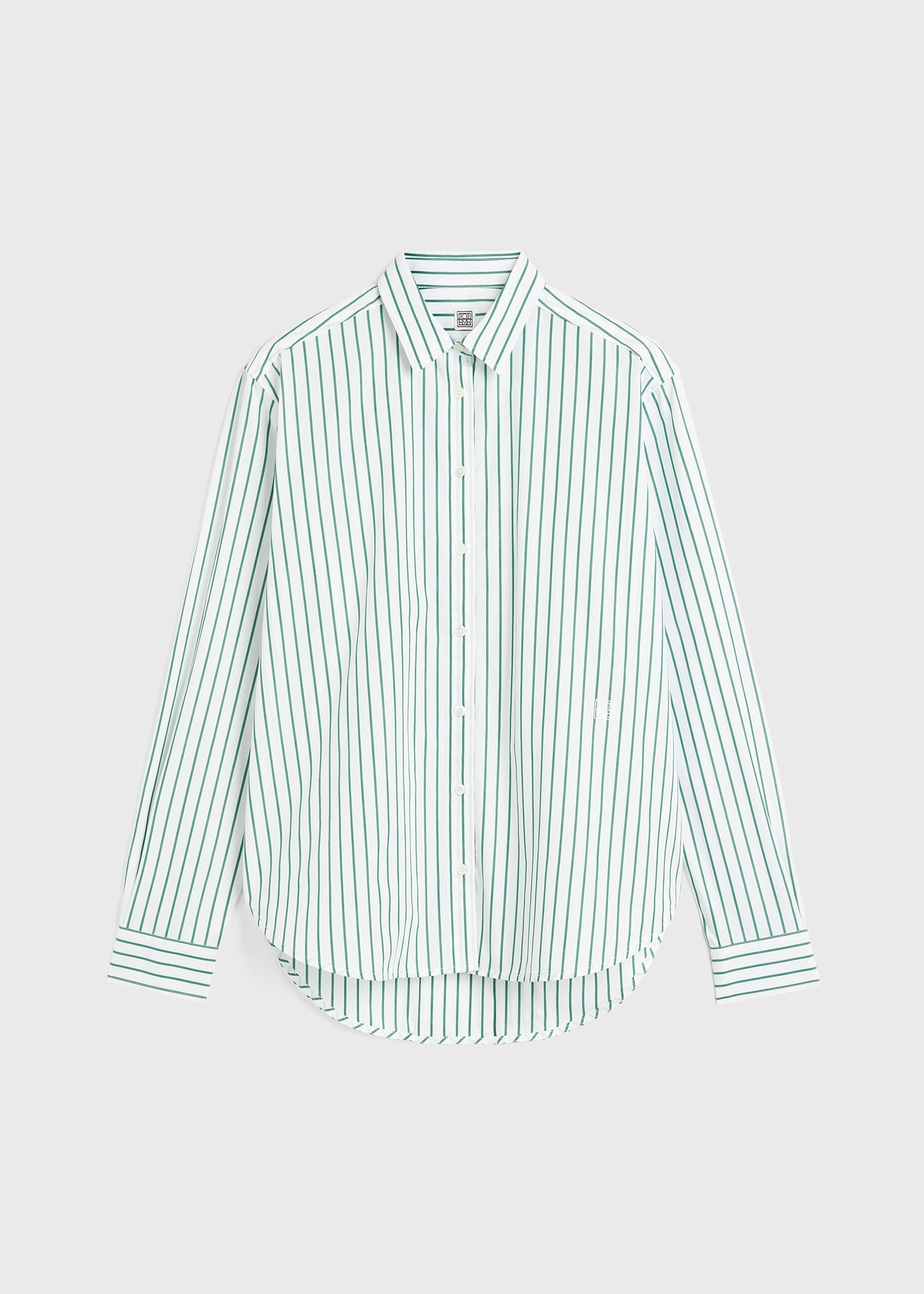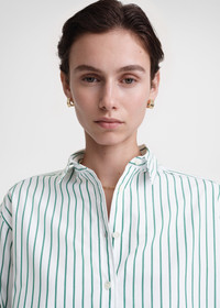 Signature TOTEME shirt constructed with a dipped back hem, resulting in a chic A-line profile. It's made from crisp organic-cotton poplin accented with pine-green stripes and shaped to a wide, slightly oversized silhouette with mother-of-pearl buttons at the placket and cuffs and a front monogram embroidery. Tuck it into trousers to work. Details & Fit - White and pine-green stripes - Embroidered monogram - Buttoned front and cuffs - 100% Organic cotton - 30°C Machine wash - Style number 234-WRT810-FB0132 - The model is 180cm/511 tall and wears a size 36 - Oversized fit, go down a size if you prefer a neater look