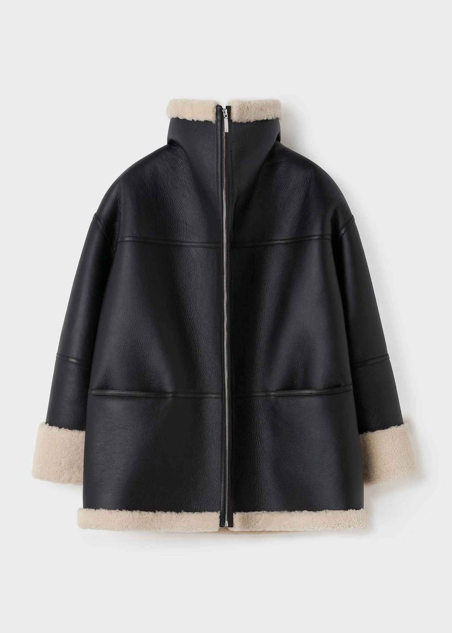 TOTEME's signature shearling jacket has a practical short length. It's made from heavyweight sheepskin leather to an oversized silhouette trimmed at the shawl lapels and cuffs with shearling as a preview of the warm interior, then is finished with a silver zipper and front in-seam pockets. Match it with the Shearling winter hat throughout winter. Details & Fit - Black/off-white - Slip pockets - Shearling lining - 100% Sheep shearling - Specialist clean - Style number 214-122-606 - Designed for an oversized fit. Take your usual size for the intended look or go down a size for a neater look. - The model is 178cm/510 tall and wears a size S
