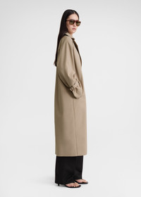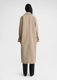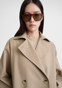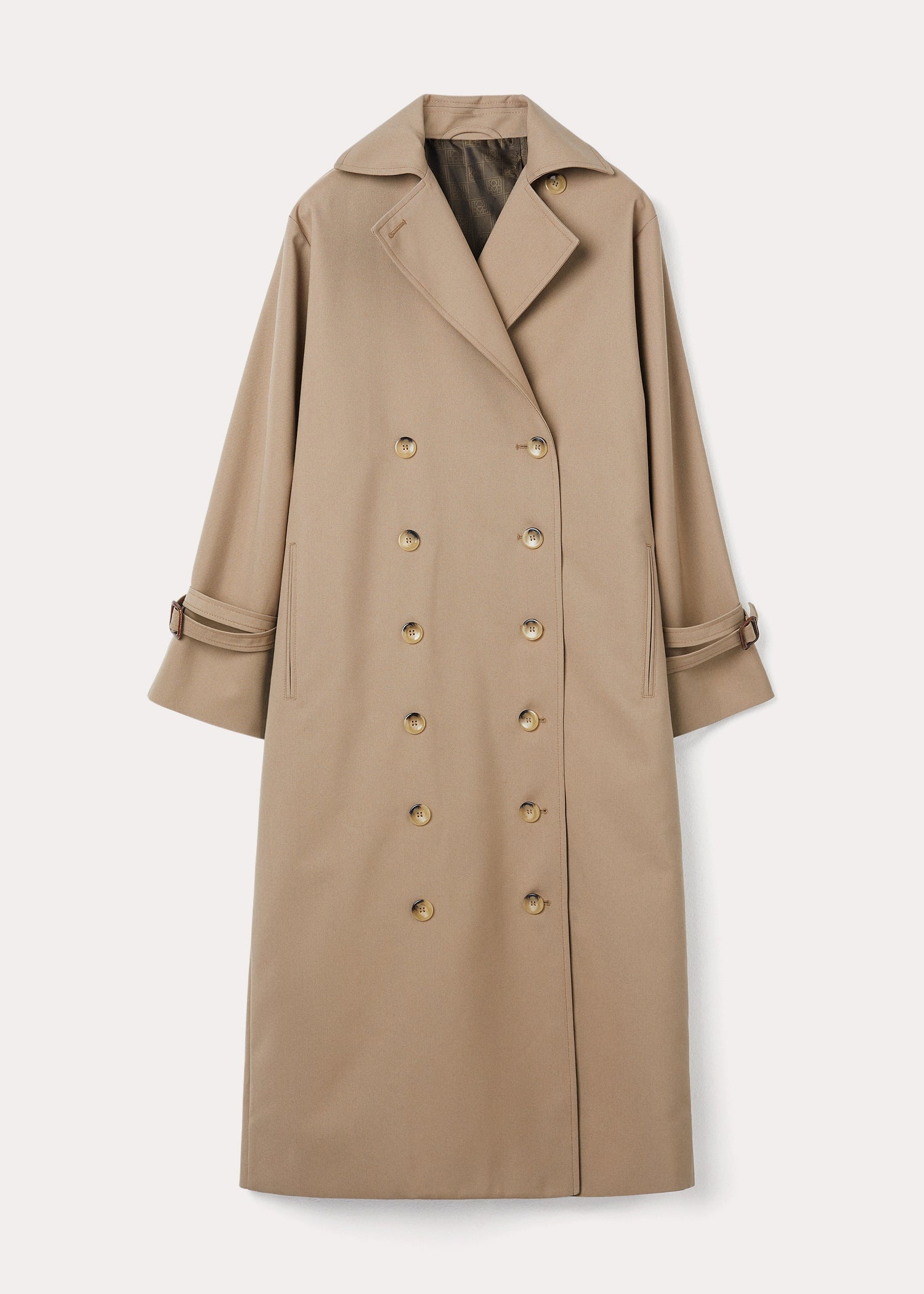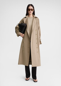 Signature TOTEME trench coat defined with an oversized silhouette that fastens with neat horn buttons along the double-breasted front. It's made from durable and water-repellent organic cotton-blend gabardine and finished with adjustable leather-buckled cuff straps and welt pockets. Wear it unbuttoned to show glimpses of the monogram-printed satin lining. Details & Fit - Khaki beige - Button front - Slip pockets - Brown monogram-print satin lining - 75% Organic cotton, 25% recycled polyester; lining: 51% polyester 49% acetate; trim: 100% leather - Dry clean only remove the leather cuff straps before washing - Style number 241-WRO1112-FB0134 - Designed for an oversized fit, go down a size if you prefer a neater look - The model is 177cm/510 tall and wears a size 34