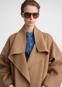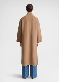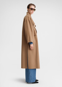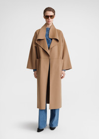 Signature coat crafted from TOTEME's soft doublé fabric – a blend of responsibly sourced wool and cashmere that's created by hand-stitching two fine layers together to achieve a double-faced finish with clean seams. It has an oversized silhouette with easy-to-style shawl lapels, dropped shoulders, and an open front that makes it perfect for layering, then is complete with inseam pockets and side slits. Coordinate it with the Long doublé scarf in the same color. Details & Fit - Camel - Open front - Inseam pockets - 90% Wool, 10% cashmere - Dry clean - The model is 178cm/510 tall and wears a size S - Designed for an oversized fit, go down one or two sizes for a neater look - Style number 211-110-717 - Designed for an oversized fit, go down one or two sizes for a neater look - The model is 177cm/58 tall and wears a size XS