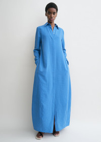 Parachute-style TOTEME shirtdress crafted from an airy, light and softly crinkled silk blend. It has an ample egg-shaped skirt with side pockets and a concealed button placket. Complement the ankle-grazing length with sandals. Details & Fit - Cobalt blue - Concealed button front - Side slip pockets - 77% silk, 23% polyamide - Cool hand wash - Style number 251-WRD4489-FB0368 - The model is 178cm/510 tall and wears a size 36 - True to size
