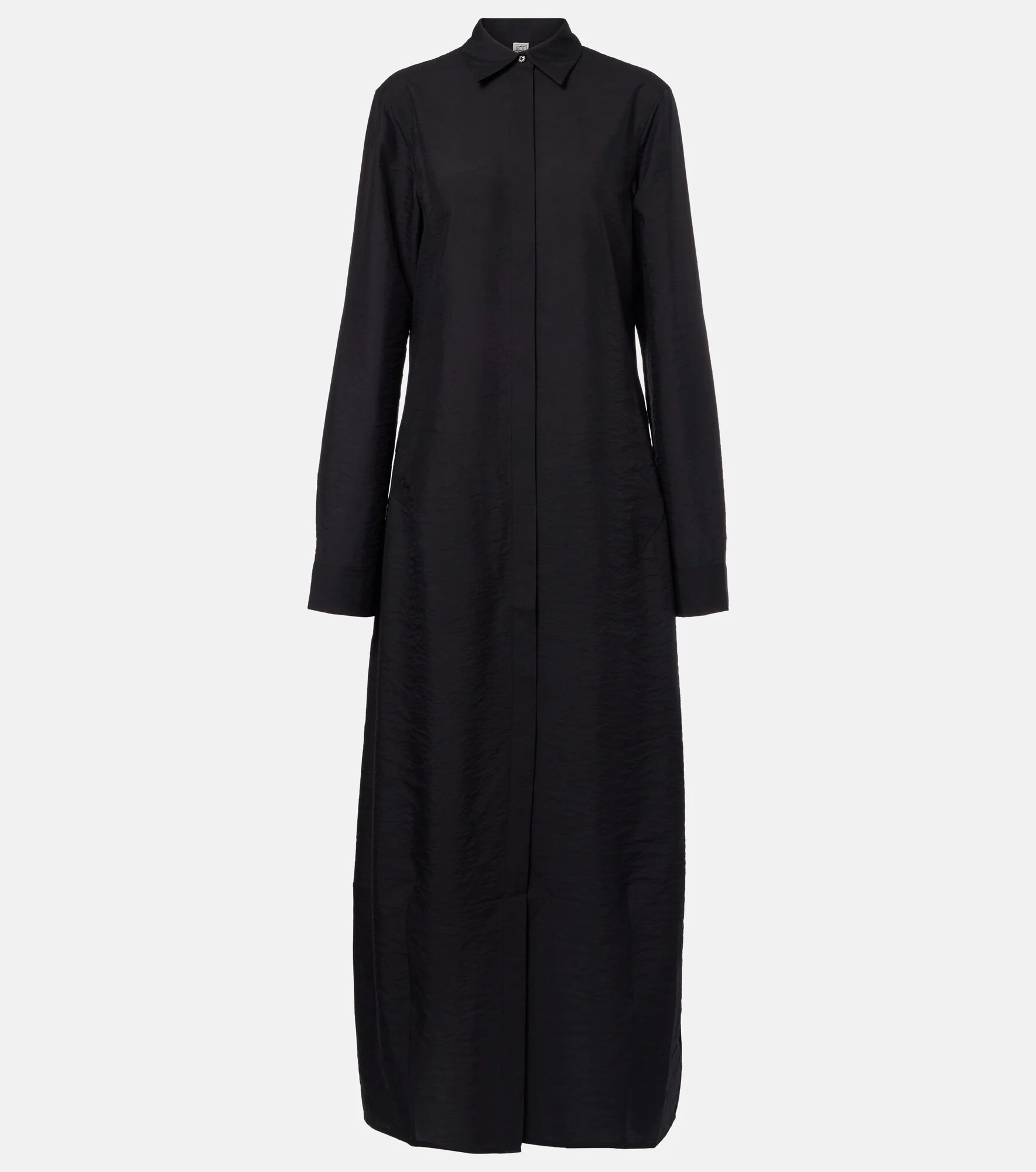 Define your dress code with styles from Toteme, a Stockholm-based brand dedicated to creating a modern uniform. Made from a crinkled silk blend, this lightweight shirt dress features a parachute-inspired silhouette with a wide, curvy skirt. Product Details - Material: 77% silk, 23% polyamide - Care instructions: hand wash - Made in China - Color: black - Designer color name: Ivory Glow - Closure: concealed button placket - Cuff: one button - Collar: classic (Straight point) - Pockets: side slit pockets - Item number: P01150368 Size & Fit - True to size - Designed for a loose fit - Non-stretchy fabric - The model seen in the picture is 178cm-5'10" and wearing a size DE 34