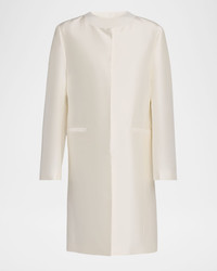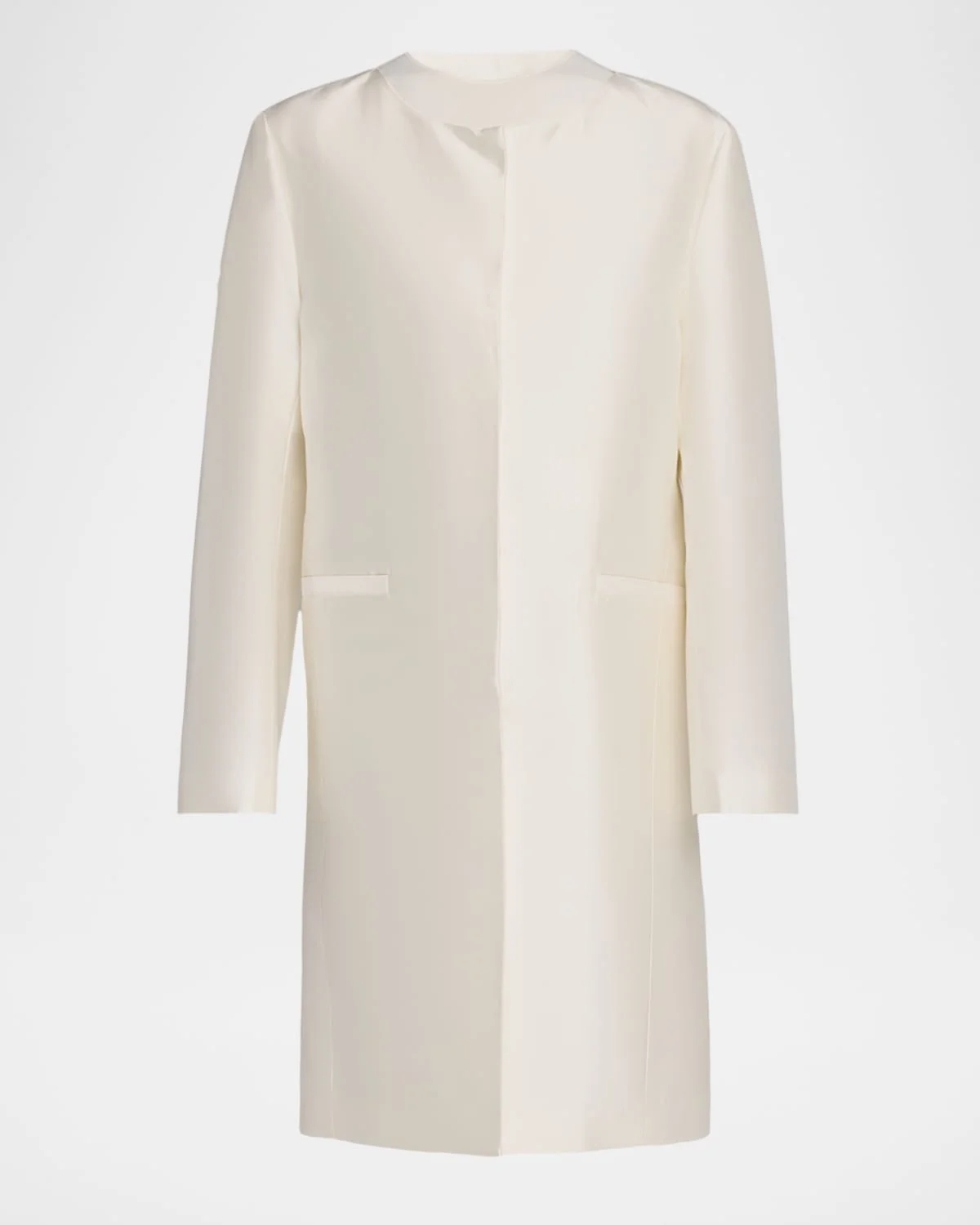 - A standout piece from the summer 25 runway show, this Toteme coat evokes unstudied minimalism through a collarless neckline and pared-back design. It is crafted from radzimir silk with a subtle sheen and fastens with concealed snap buttons. - Round neckline; concealed snap front - Long sleeves - Straight fit - Knee length - Silk - Dry clean - Imported