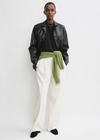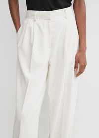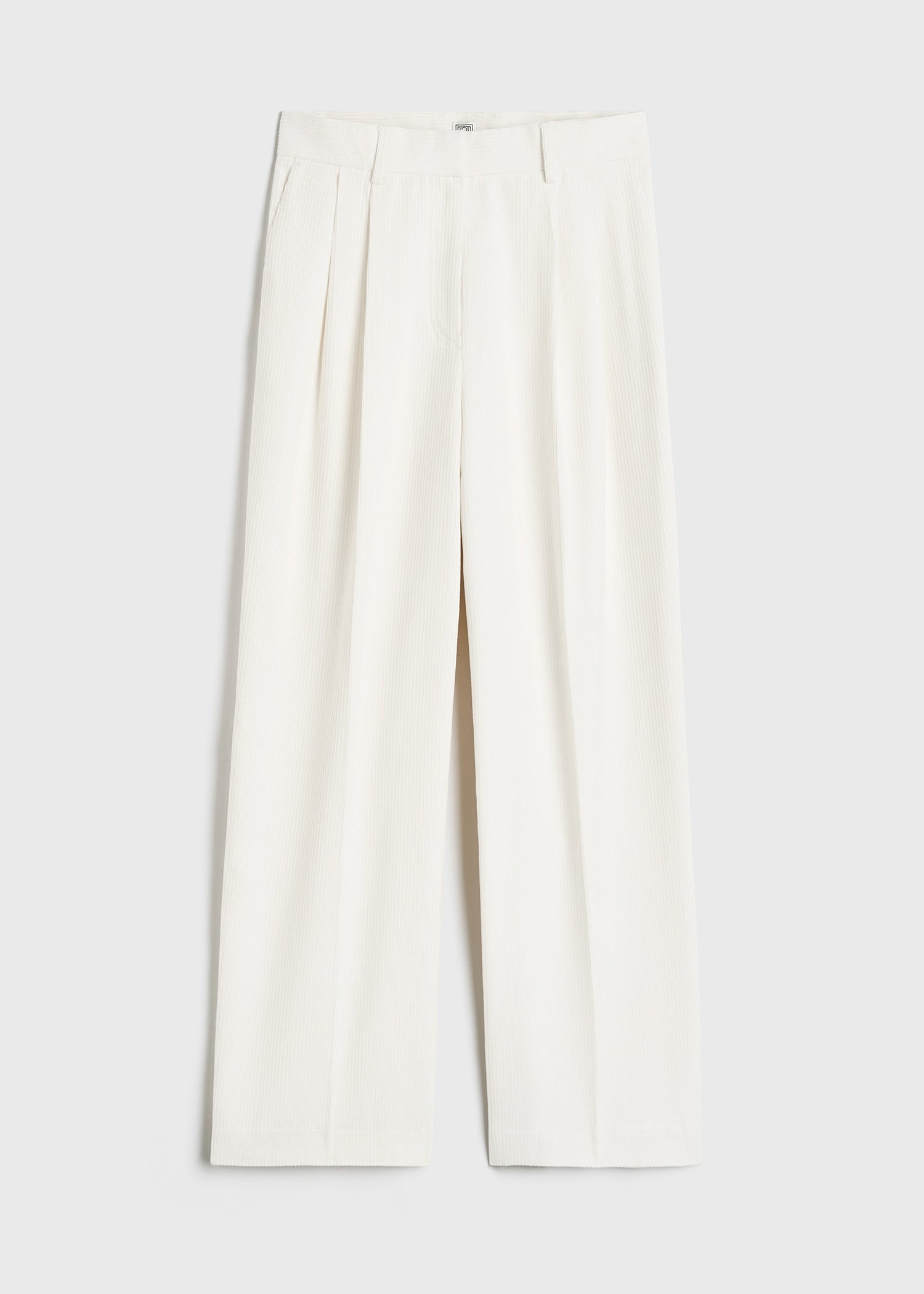 Double-pleated TOTEME chino trousers made from light and soft silk-cotton corduroy. They have straight legs with a relaxed fit and are finished with a tailored high waistband with belt loops, side pockets and a zipper fly. Give them an urban edge by wearing them with a top and leather jacket. Details & Fit - Meringue - Belt loops - Side pockets - Zipper fly - 53% silk, 47% organic cotton; lining: 100% viscose - Dry clean - Style number 243-WRB0202-FB0191 - The model is 180cm/511 tall and wears a size 36 - True to size, relaxed straight legs