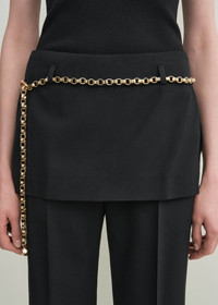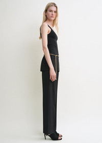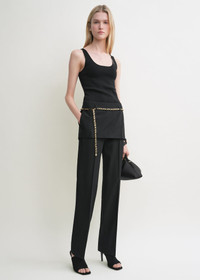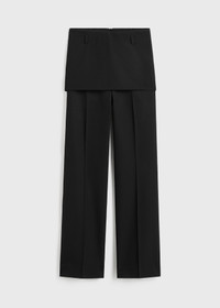 Straight TOTEME trousers overlapped with a top panel mimicking a skirt – capturing the Summer 25 collection's layering theme. They are tailored from fluid wool and have side pockets as well as a concealed back zipper that are effortlessly blended into both layers. Slip a belt through the belt loops for a sophisticated finish. Details & Fit - Black - Belt loops - Skirt panel, slip pockets - Concealed back zipper - Mid-weight, fluid wool - 100% wool - Dry clean - Style number 253-WRB0284-FB0435 - The model is 178cm/510 tall and wears a size 36 - True to size, straight fit