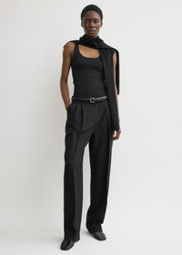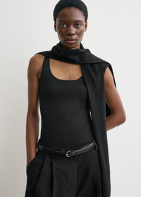 Designed to mimic a sweater thrown over the shoulders, this scarf has faux sleeves that can be left to drape or be artfully tied at the chest. It is knitted from soft and warm cashmere with gently ribbed edges. Details & Fit - Black - Neckless construction, open hem - 100% cashmere - Cool hand wash - Style number 254-WSC0113-YA0016