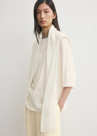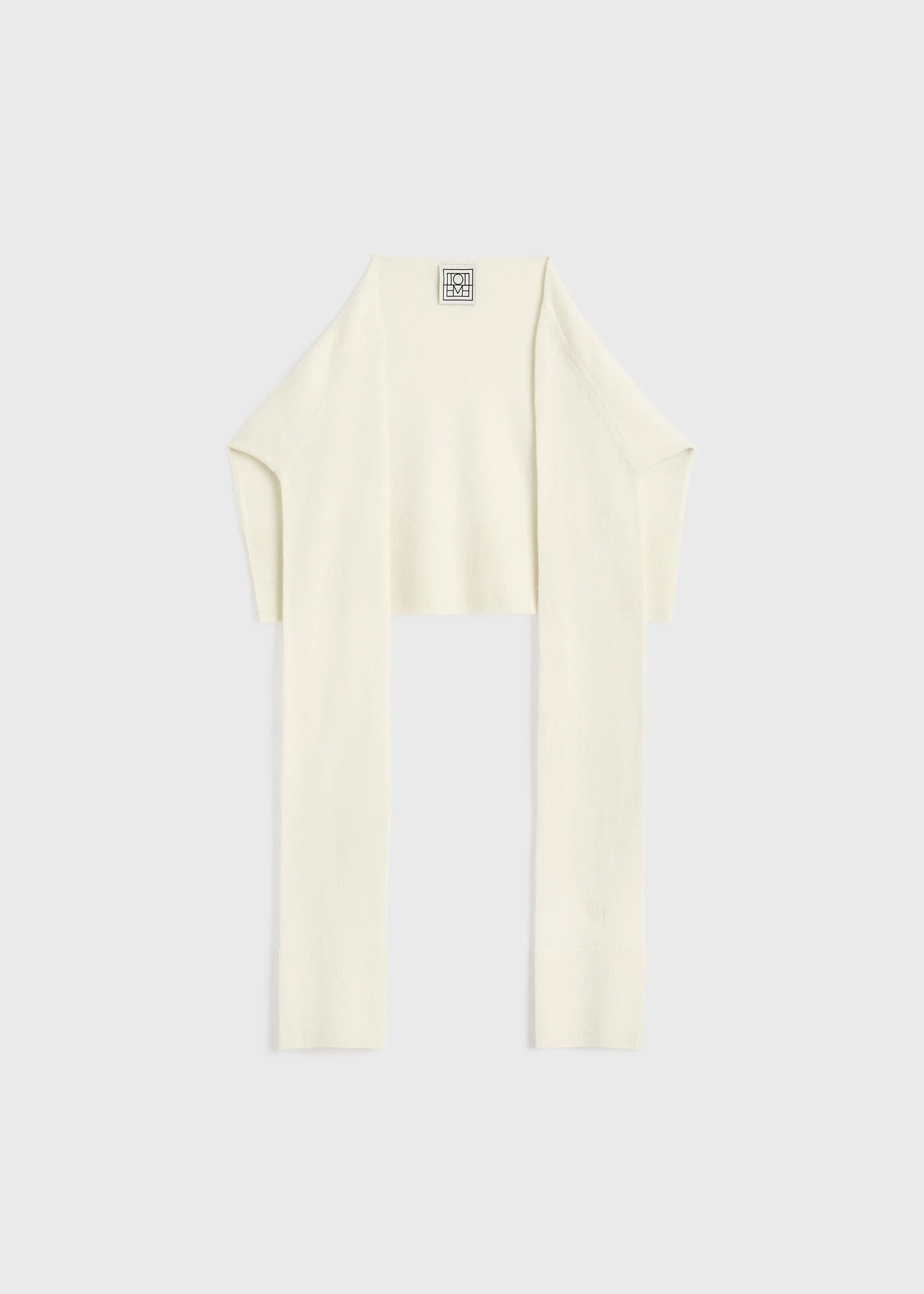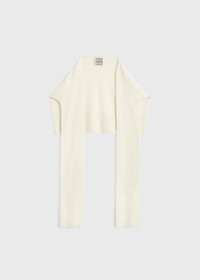 Designed to mimic a sweater thrown over the shoulders, this scarf has faux sleeves that can be left to drape or be artfully tied at the chest. It is knitted from soft and warm cashmere with gently ribbed edges. Details & Fit - White - Neckless construction, open hem - 100% cashmere - Cool hand wash - Style number 254-WSC0113-YA0016