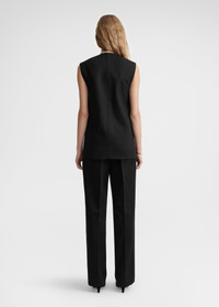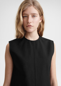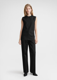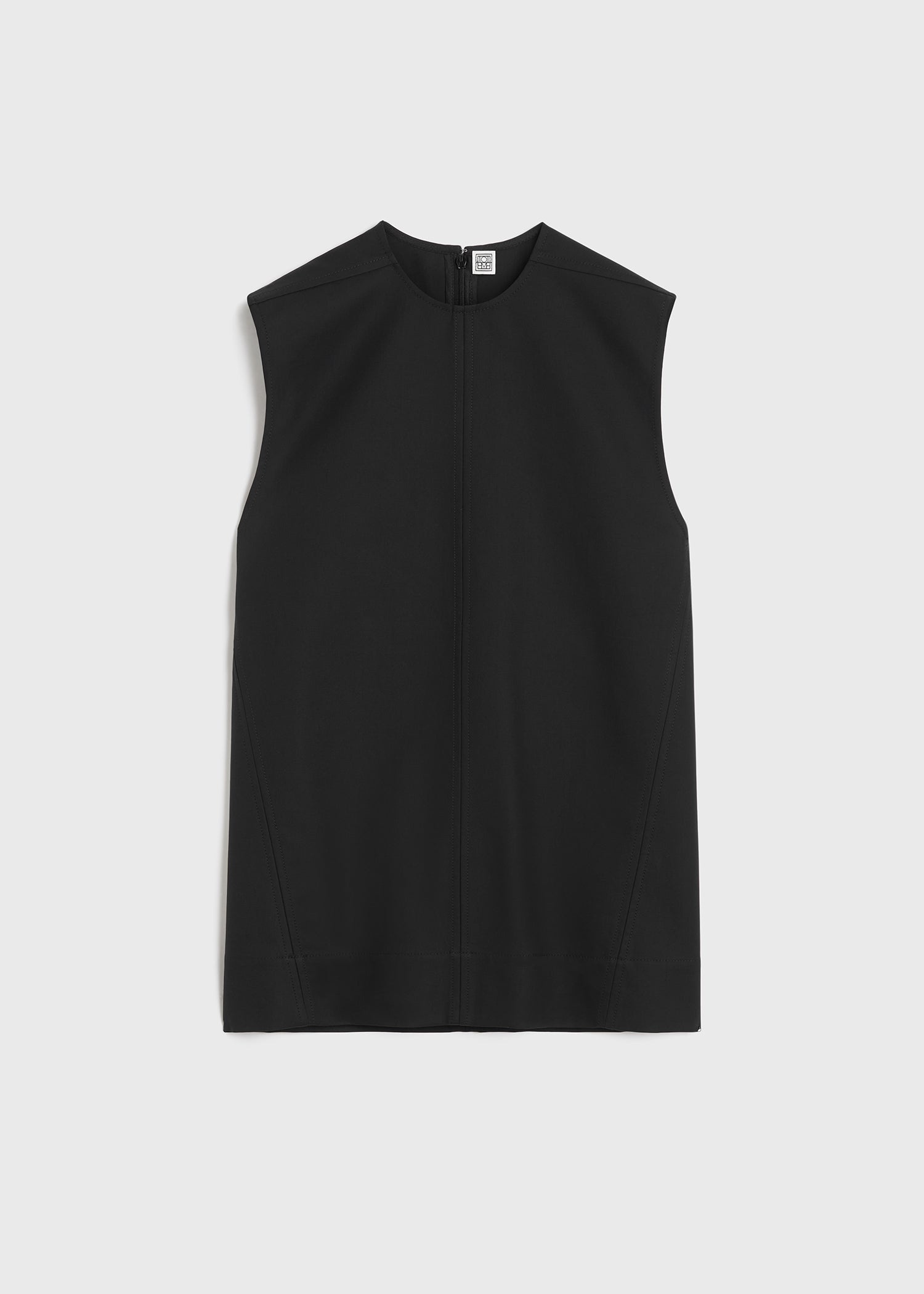 Minimalist sleeveless top constructed with TOTEME's signature twisted side seams to frame a clean, slightly tapered silhouette that sits at the hips. It's made from compact organic cotton with a round neckline and a concealed back zipper. Dress it up and down throughout the summer. Details & Fit - Black - Twisted side seams - Concealed back zipper - 100% cotton organic - 30°C Machine wash - Style number 242-WRT1446-FB0102 - The model is 177cm/59 tall and wears a size 36 - Regular fit; boxy at the top, fitted on the hips