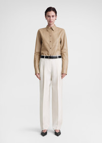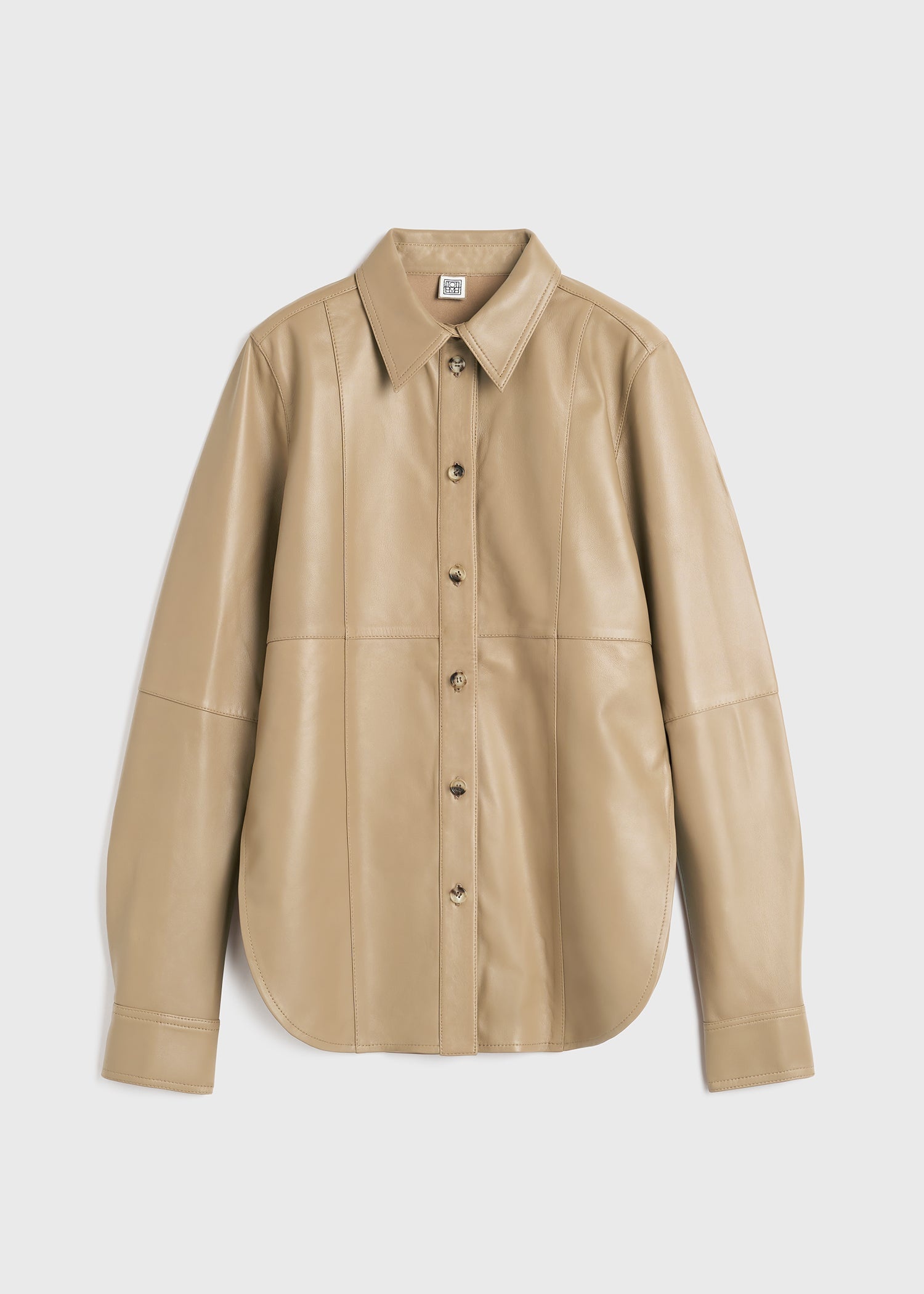 Slim TOTEME shirt reworked in butter-soft Nappa leather. It's constructed with darts and symmetric panels contrasted with a high-curved hem at the base of the buttoned placket. Team it with tonal trousers for a meeting. Details & Fit - Biscuit - Buttoned front and cuffs - High curved hem - 100% Lamb leather - Specialist clean - Style number 241-WRT1091-LE0021 - The model is 180cm/511 tall and wears a size 36 - True to size, relaxed slim fit