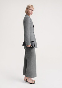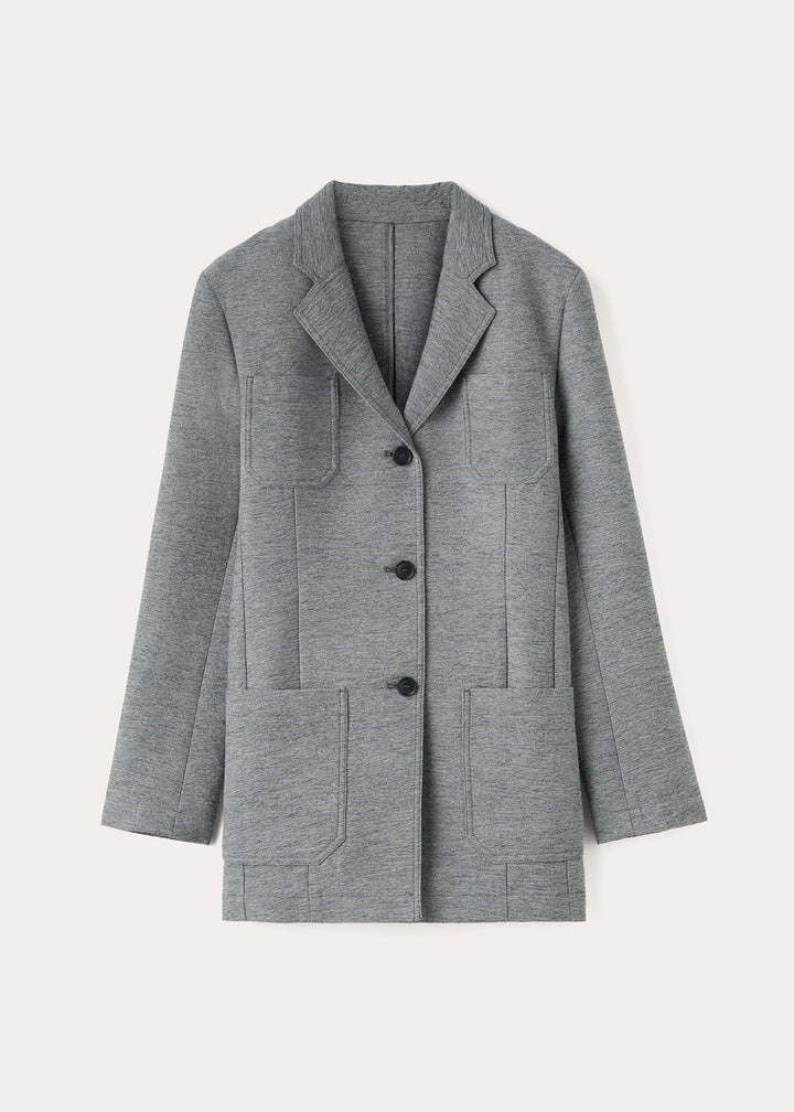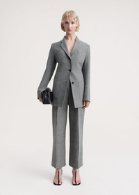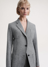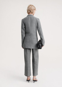 Longline TOTEME blazer with a slim silhouette featuring notched lapels, a buttoned front, and four patch pockets that give it a utilitarian air. It's woven with uneven wool-blend yarns for a textured feel that matches the Clean wide trousers. Details and fit - Grey mélange - Four patch pockets - Buttoned front - 56% Recycled wool, 28% recycled polyester, 11% polyamide, 5% other fibers - Dry clean - Style number 233-3011-278 - The model is 178cm/5’10” tall and wears a size 34 - True to size, slim fit