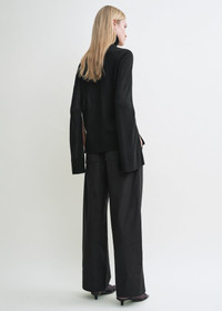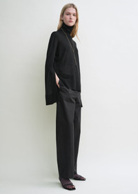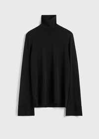 A foundational piece from the Summer 25 runway, this TOTEME turtleneck sweater is designed with high cuff slits for dramatic effect. It is finely knitted from Lyocell with a hint of cashmere – a breathable blend inspired by crisp Scandinavian summer nights. Team it with high leather gloves or a delicate bracelet. Details & Fit - Black - High cuff slits - Hem slits - Light, semi-sheer knit - 90% lyocell, 10% cashmere - Cool hand wash - Style number 253-WRT0535-YA0079 - The model is 178cm/510 tall and wears a size S - True to size, regular fit
