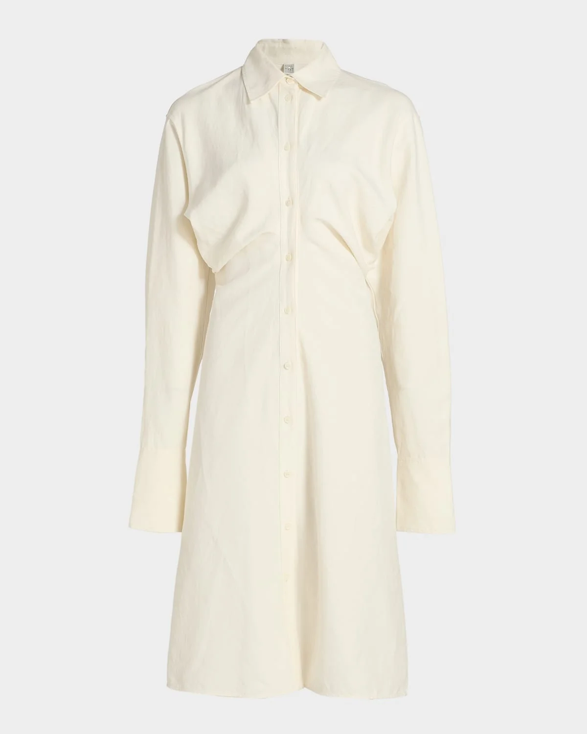 Crafted from viscose-blend, this shirtdress from Toteme & nbsp;offers a modern silhouette with its unique slouched waist detail & nbsp; Point collar; button front placket Dropped shoulders Long sleeves; button cuffs A-line silhouette Hem hits around the knee Viscose/polyester/nylon/polyamide/elastane Dry clean Imported SIZE & FITModel measurements: 5 & apos;10" tallModel is wearing a US size 4/Small