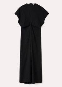 Long TOTEME dress woven from heavyweight viscose, linen, and cotton canvas. It's constructed from curved panels that create a slouching effect at the waist when sewn together at the center, and fastens with a concealed back zipper. Pair it with heels or flats for a dinner with friends. Details & Fit - Black - 67% Viscose, 24% linen, 9% cotton - Dry clean - Style number 232-6024-216 - The model is 179cm/5'9" tall and wears a size 34 - Slim waist and hips. Fits small, take one size up