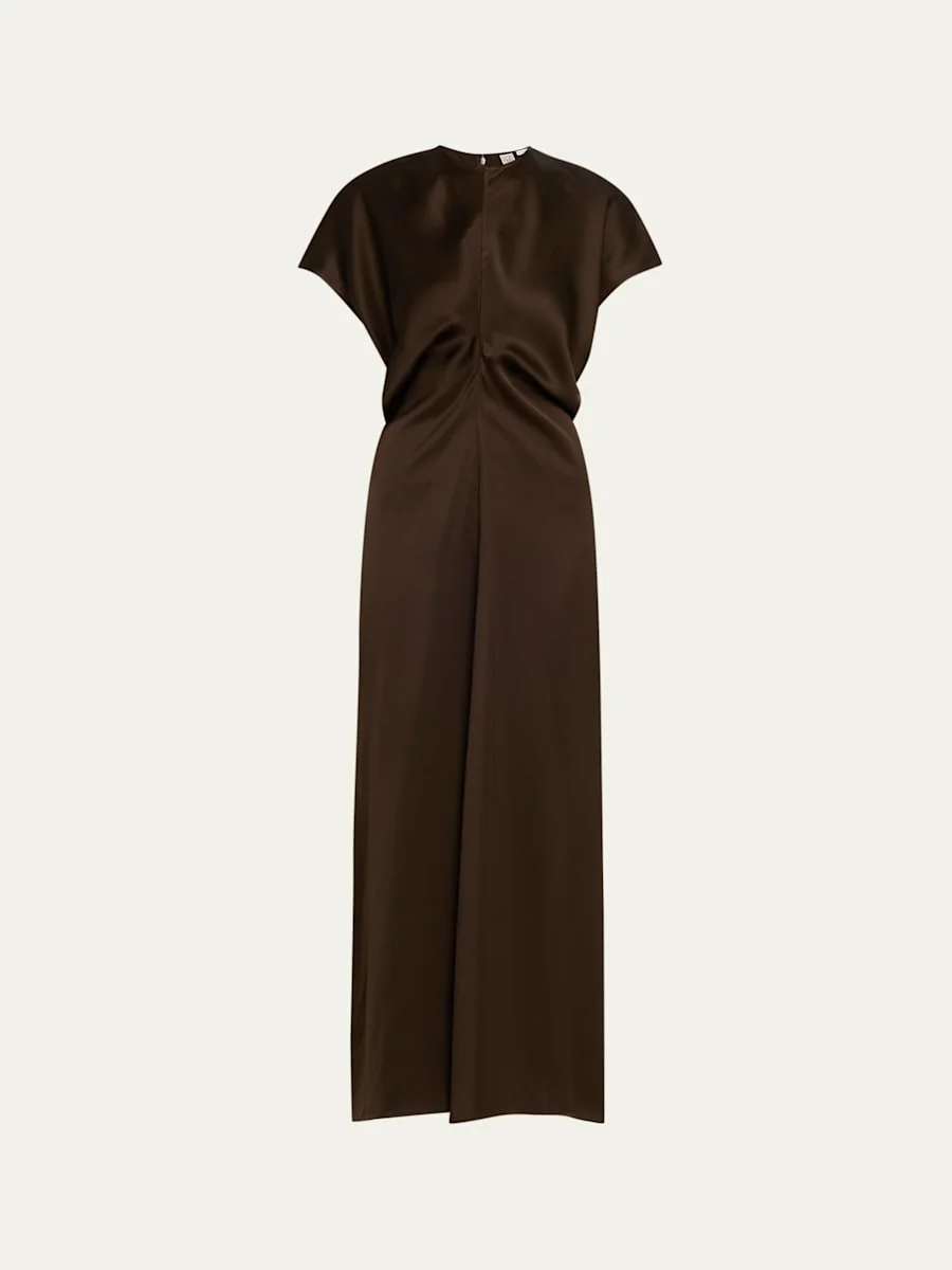 Constructed by sewing together two curved fabric panels to create a slouching effect at the waist, this dress from Toteme is crafted from fluid satin with a textured crepe reverse and falls to a floorgrazing hem. Approx. 55"L from shoulder to hem Round neckline Short sleeves Draped waist Column silhouette Full length Invisible back zip Viscose Lining: Viscose Hand wash Please note: compared to the brand's size guide, this style measures true to size. Imported SIZE amp; FITModel measurements: 5'10" tall Model is wearing a US size 4/Small