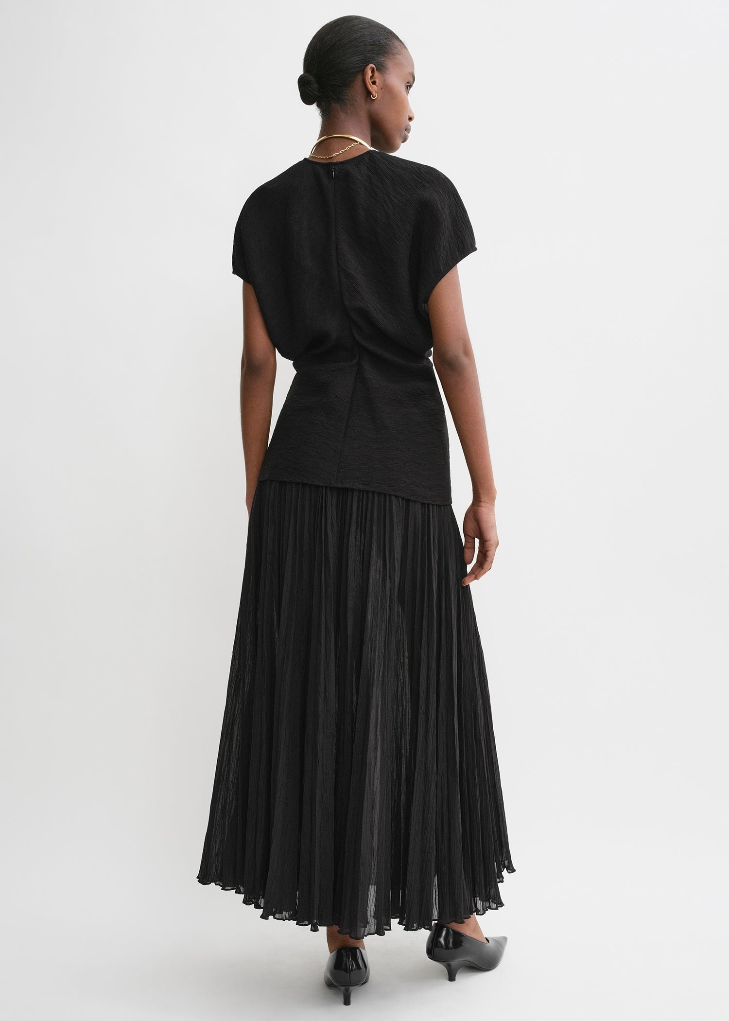 TOTEME top constructed from curved panels that create a slouching effect at the waist when sewn together. It is made from a soft, crinkled fabric and fastens with a concealed back zipper. Complete an occasion look with the tonal skirt. Details & Fit - Black - Concealed back zipper - 92% viscose, 8% polyamide - Hand wash - Style number 243-WRT0331-FB0199 - The model is 180cm/511 tall and wears a size 36 - True to size, slim waist
