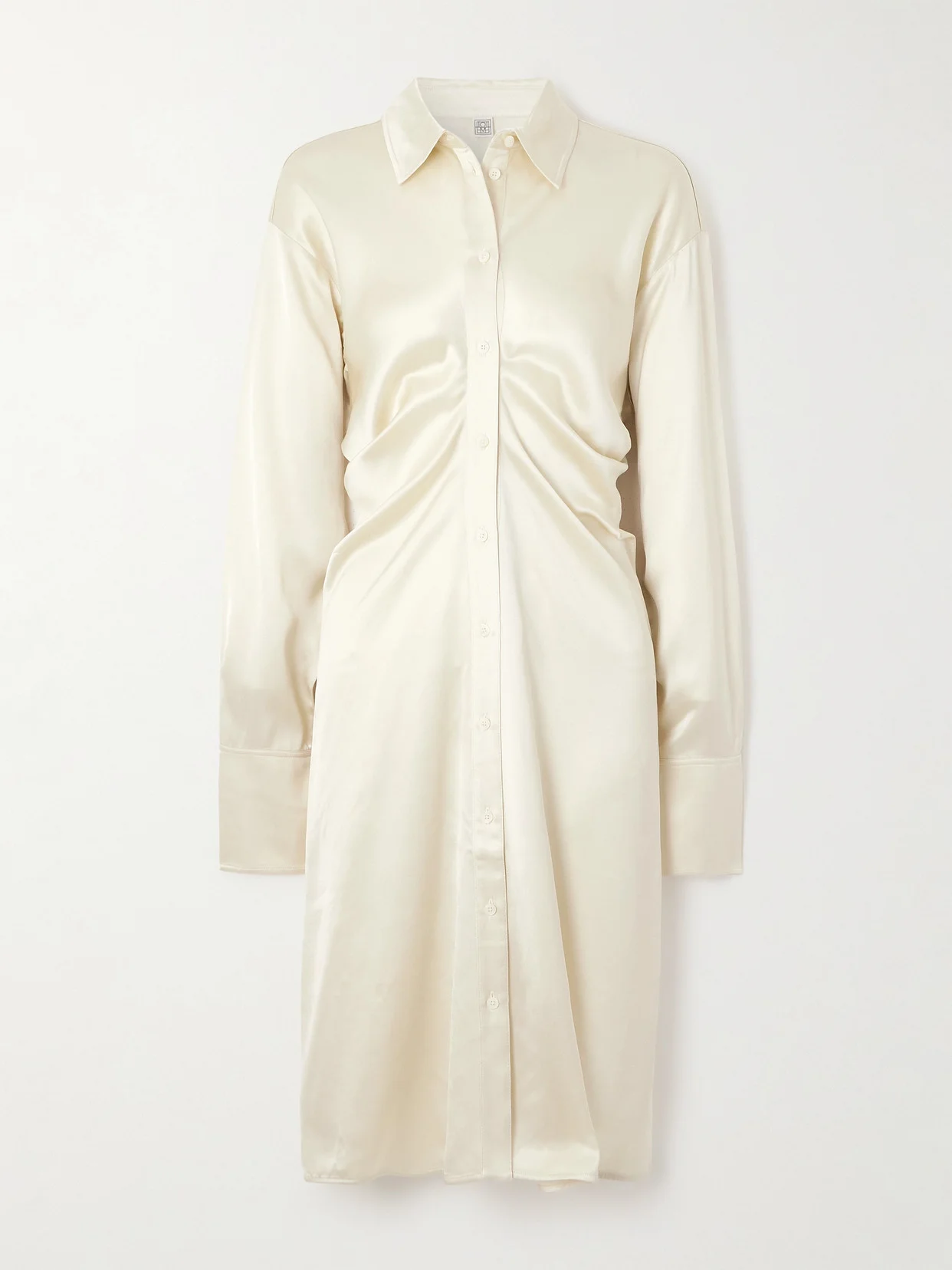 Building on its signature Scandinavian codes, TOTEME's Fall '25 collection emphasized ease and fluidity. Shown on the Paris runway, this shirt-inspired dress is cut from satin-crepe with a gathered waist that creates an effortless drape. Pair it with a plush coat and knee boots.