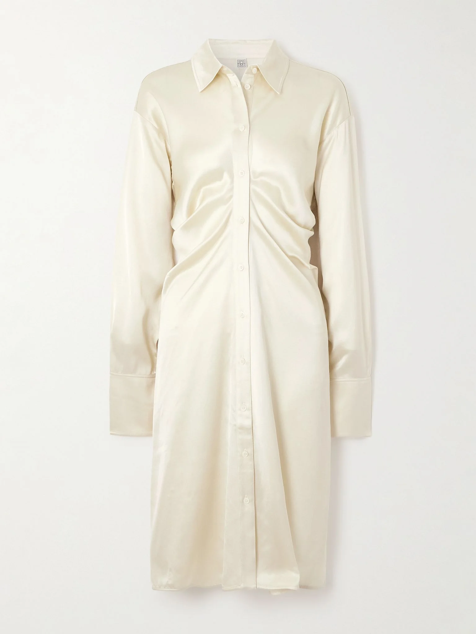 Building on its signature Scandinavian codes, TOTEME’s Fall ’25 collection emphasized ease and fluidity. Shown on the Paris runway, this shirt-inspired dress is cut from satin-crepe with a gathered waist that creates an effortless drape. Pair it with a plush coat and knee boots. Size & Fit TOTEME follows its own size guide, please refer to below: - DK 32 = UK 4/ US 0/ IT 36 - DK 34 = UK 6/ US 2/ IT 38 - DK 36 = UK 8/ US 4/ IT 40 - DK 38 = UK 10/ US 6/ IT 42 - DK 40 = UK 12/ US 8/ IT 44 - DK 42 = UK 14/ US 10/ IT 46 - Fits true to size, take your normal size - Designed for a slightly loose fit - Lightweight, non-stretchy fabric - Model is 177cm/ 5'10" and is wearing a DK 34 Model measurements: - Bust: 86cm/ 34" - Waist: 65cm/ 25.5" - Hip: 90cm/ 35.5" Details & Care - White satin-crepe - Button fastenings through front - 100% viscose - Dry clean