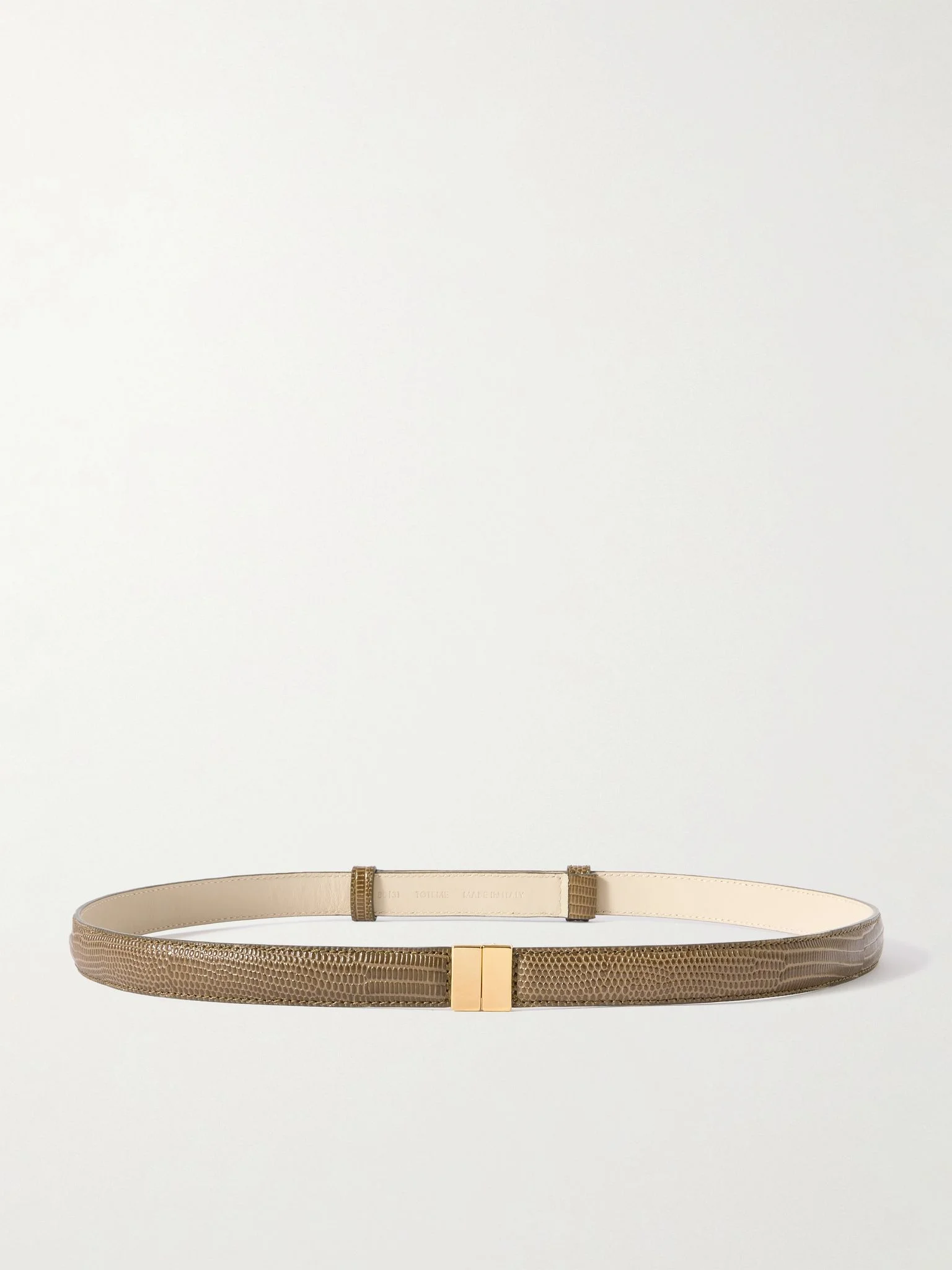 Made from snake-effect leather, TOTEME's belt will add a cool texture to any outfit. It has a slender shape and fastens with a gold-tone clasp, inspired by the strap that cinches the label's signature totes. Size & Fit - Designed to be worn on the hips or waist - Measurements can be found in the link below Details & Care - Army-green snake-effect leather (Calf) - Push-clasp fastening