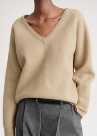 Effortless TOTEME sweater outlined with a V-neck and raglan sleeves that round gently over the shoulders. It's knitted from light and soft merino-wool felt to a boxy silhouette that sits at the hips, creating a subtle but sculptural volume at the back. Pair it with jeans for an after-work outing. Details and fit - Oat - 98% Wool, 2% polyamide - Cool hand wash - The model is 179cm/5’10” tall and wears a size S - True to size, loose fit - Style number 234-WRTWTP158-YA0011