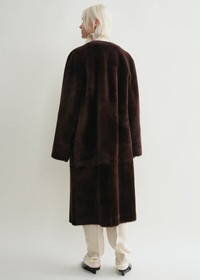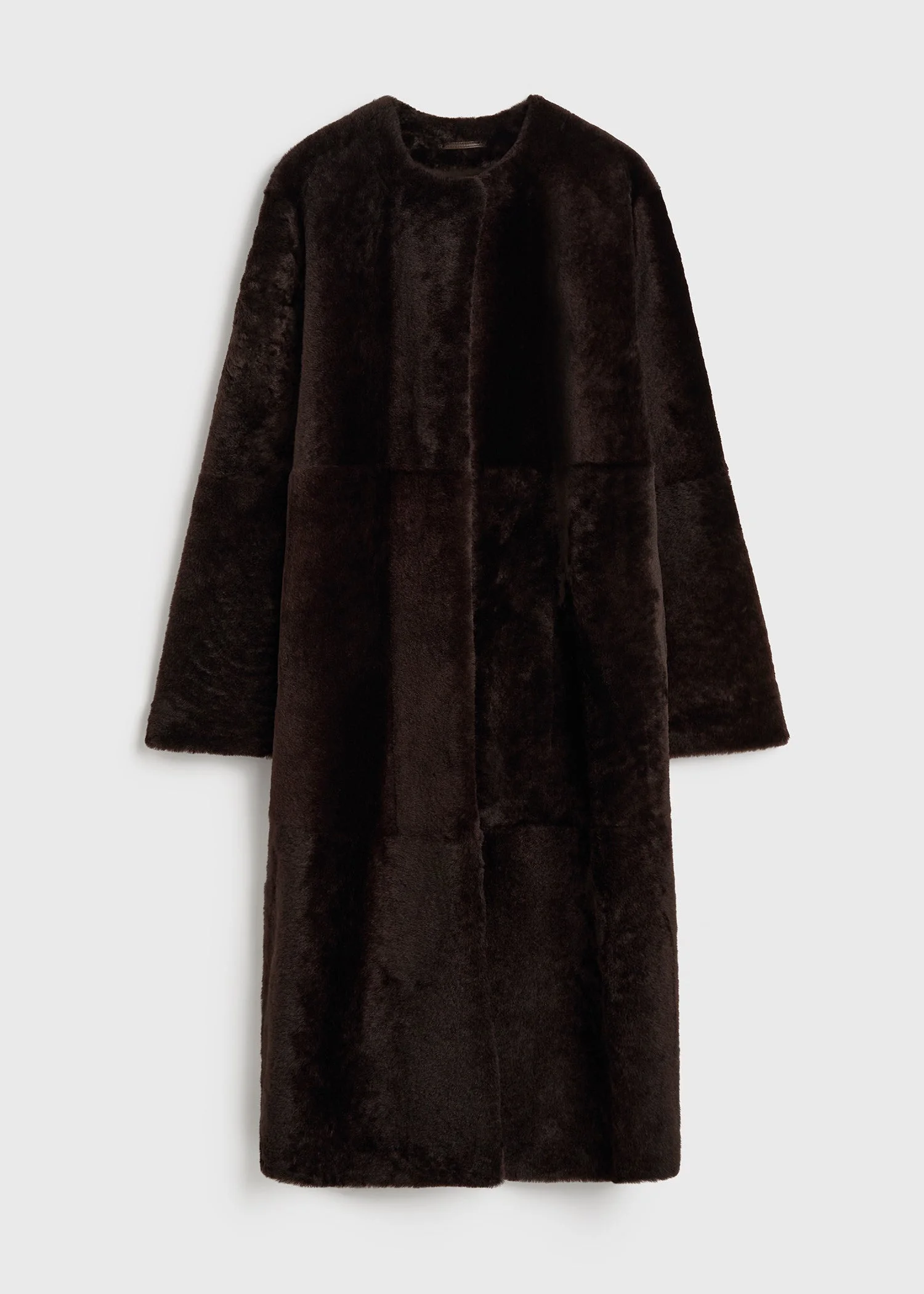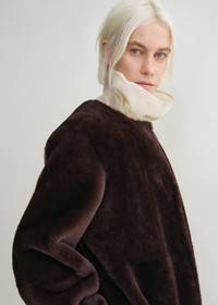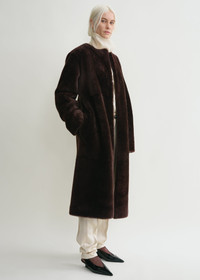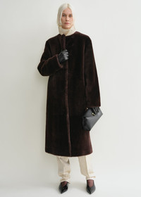 Statement TOTEME coat from our FW24 runway show, crafted from soft lamb shearling with an elegant shaved finish. It has a round neckline and concealed hooks leading to a supple suede interior, then is complete with two side pockets. Highlight the deep hue with neutral separates. Details & Fit - Bark - Concealed hooks and eyes - Side slip pockets - Suede interior - 100% lamb leather - Specialist clean - Style number 244-WRO0158-LE0087 - The model is 178cm/510 tall and wears a size 36 - True to size