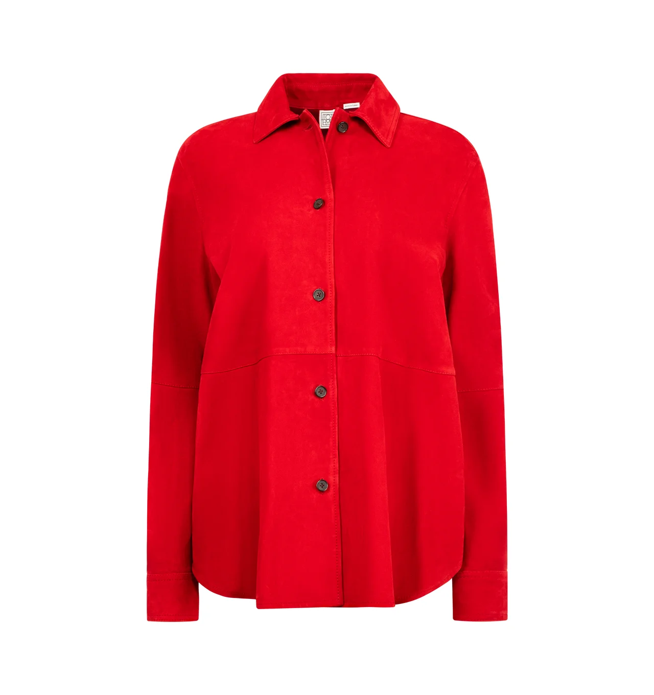 TOTEME Soft Suede Shirt featuring buttersoft suede, paneled straight silhouette fastening with buttons at the placket and cuffs, collar and long sleeves. 100% lamb leather. DESIGNER STYLE ID: 261-WRT0707-LE0200 COLOR: 344 POPPY