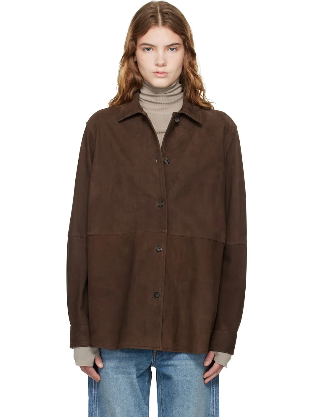 Loose-fit suede lambskin jacket. · Certified LWG leather · Paneled construction · Spread collar · Button closure · Shirttail hem · Dropped shoulders · Pleats at barrel cuffs Supplier color: Bark 100% lambskin. Made in Turkey 261771F064004