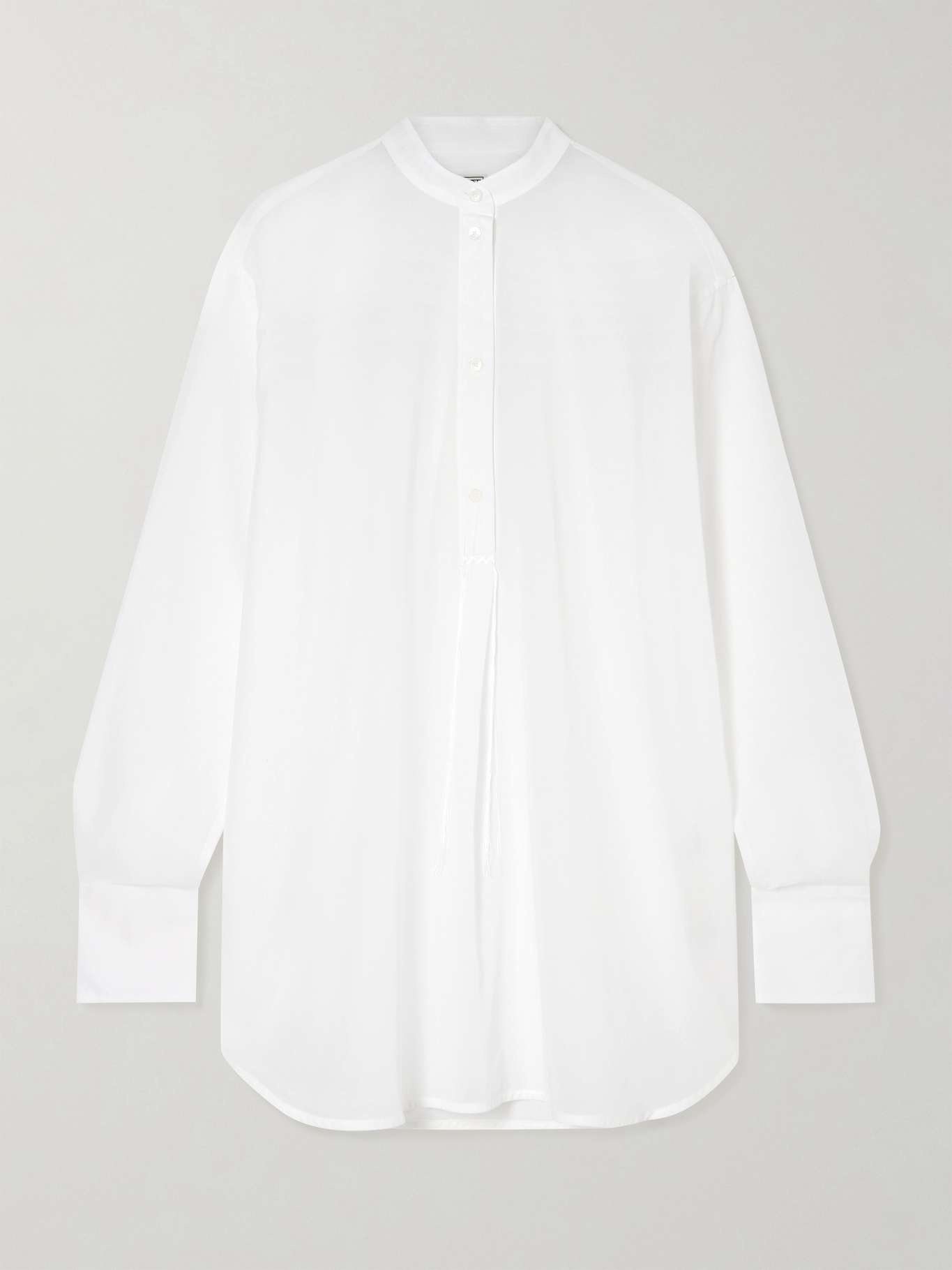 EDITORS'NOTES TOTEME's shirt is particularly fine, so it's sheer and wonderfully airy. It's cut from a beautiful organic cotton-voile with clean lines in loose proportions. The placket fastens with mother-of-pearl buttons and is finished with tonal crisscross embroidery and subtle hanging tassels. SIZE & FIT TOTEME follows its own size guide, please refer to below: - DK 32 = UK 4/ US 0/ IT 36 - DK 34 = UK 6/ US 2/ IT 38 - DK 36 = UK 8/ US 4/ IT 40 - DK 38 = UK 10/ US 6/ IT 42 - DK 40 = UK 12/ US 8/ IT 44 - DK 42 = UK 14/ US 10/ IT 46 - Fits true to size, take your normal size - Designed for a loose fit - Lightweight, semi-sheer, non-stretchy fabric - Model is 175cm/ 5'9" and is wearing a DK 34 - Bust: 81cm/ 32" - Waist: 62cm/ 24.5" - Hip: 89cm/ 35" DETAILS & CARE - White organic cotton-voile - Button fastenings along front - 100% organic cotton - Dry clean - Mother-of-pearl: Indonesia