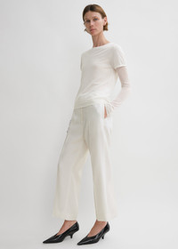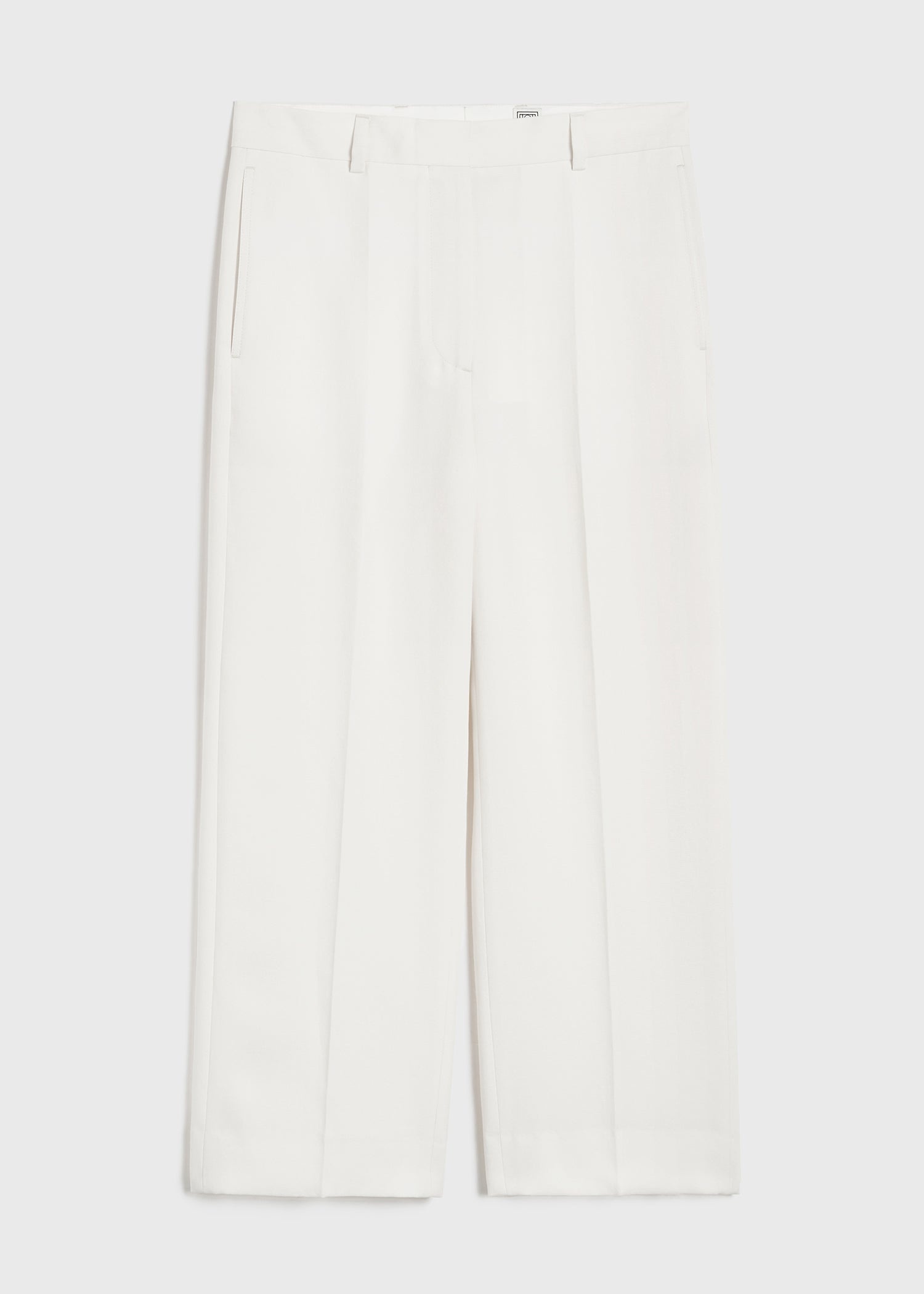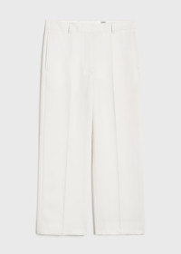 Cropped TOTEME trousers tailored from recycled polyester and certified wool fibers to match our signature Double-breasted blazer. They have a flattering silhouette with a mid waist followed by long, straight legs set with belt loops, a zipper fly, side and back pockets. Add a top or blouse for a casual meeting. Details & Fit - Off-white - Belt loops - Side and back pockets - Zipper fly - 78% viscose, 22% polyester; lining: 100% viscose - Dry clean - Style number 243-WRB4511-FB0065 - The model is 180cm/511 tall and wears a size 36 - True to size, straight legs