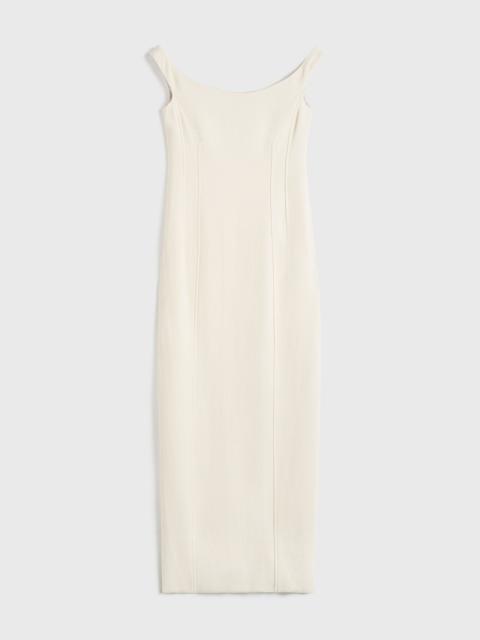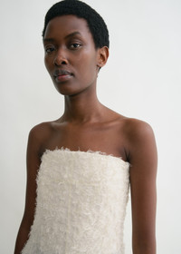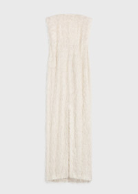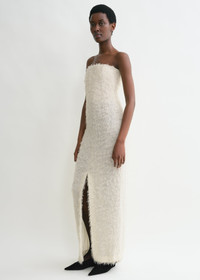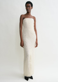 TOTEME occasion dress crafted from fil coupe, a whisper-light fabric with soft threads reminiscent of feathers. It has a strapless neckline with an internal corset-like structure that elegantly drives the fabric away from the body, then fastens with a concealed back zipper. Style it with pumps to attend a formal event. Details & Fit - Ecru - Front slit - Internal structure - Concealed back zipper - 100% viscose; internal structure: 93% polyester - Dry clean - Style number 244-WRD0133-FB0287 - True to size, internal bustier with slim chest and waist - The model is 178cm/510 tall and wears a size 36