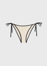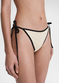 Minimalist bikini bottoms inspired by the contrasting stripes on TOTEME's Centered monogram silk scarf. They're made from fully lined stretch jersey with a mid-waist, high-leg silhouette fastened with black ties on the hips. Complete the look with the matching bikini top. Details & Fit - Light hay - Black ties - Fully lined - 71% Recycled polyamide, 29% elastane - 30°C Machine wash - Style number 241-WSW1029-FB0097 - The model is 175cm/59 tall and wears a size S - True to size