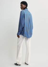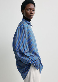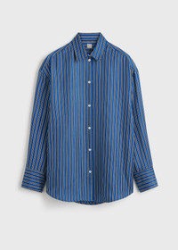 An oversized shirt challenging traditional shirting cues through voluminous sleeves with long cuffs. It is made from striped silk inspired by our silk scarf collection and fastens with classic mother-of-pearl buttons. Wear it with the collar turned up and jeans. Details - Blue/navy - Buttoned placket and cuffs - Wide, two-part sleeve - Back T-stitch - 100% silk - Dry clean - Style number 261-WRT0803-FB0553 Fit information - The model is 180cm/5'11” tall and wears a size 36 - Oversized fit, wide sleeves Origin & Certificates - Country of origin: Portugal - Manufacturer: FSM - Industria De Confeccoes, S.A
